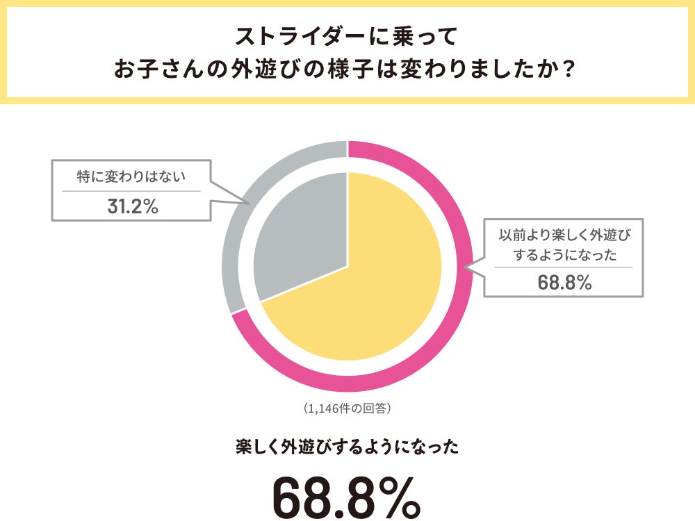 ストライダーに乗ってお子さんが以前より楽しく外遊びするようになったと回答した方は68.8%と半数以上にのぼり、小さな子どもにとってストライダーに乗って遊ぶことは、何かを自在にコントロールできるようになるという今までにない経験や自信を得ることが出来るため、外遊びが楽しくなるということがうかがえる結果となりました。