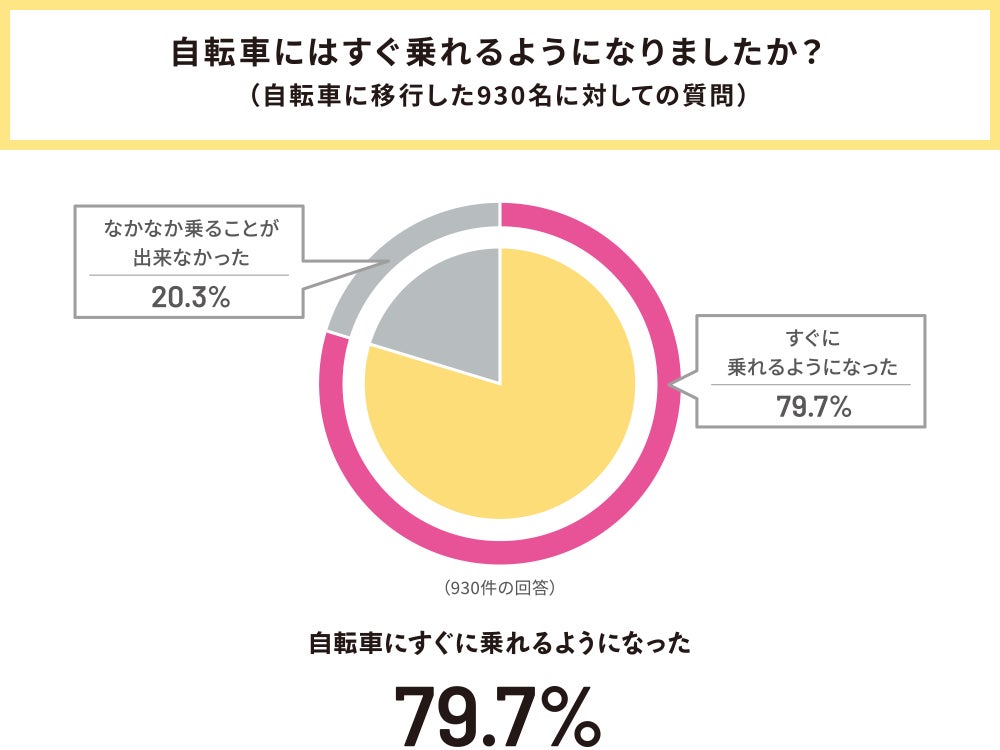 ストライダーから自転車に移行した約8割の方が、自転車にすぐ乗れるようになったと回答していることから、ストライダーに乗ってバランス感覚や体幹を身につけさえすれば、驚くほど簡単に自転車に乗れるようになるということがわかる結果となりました。
