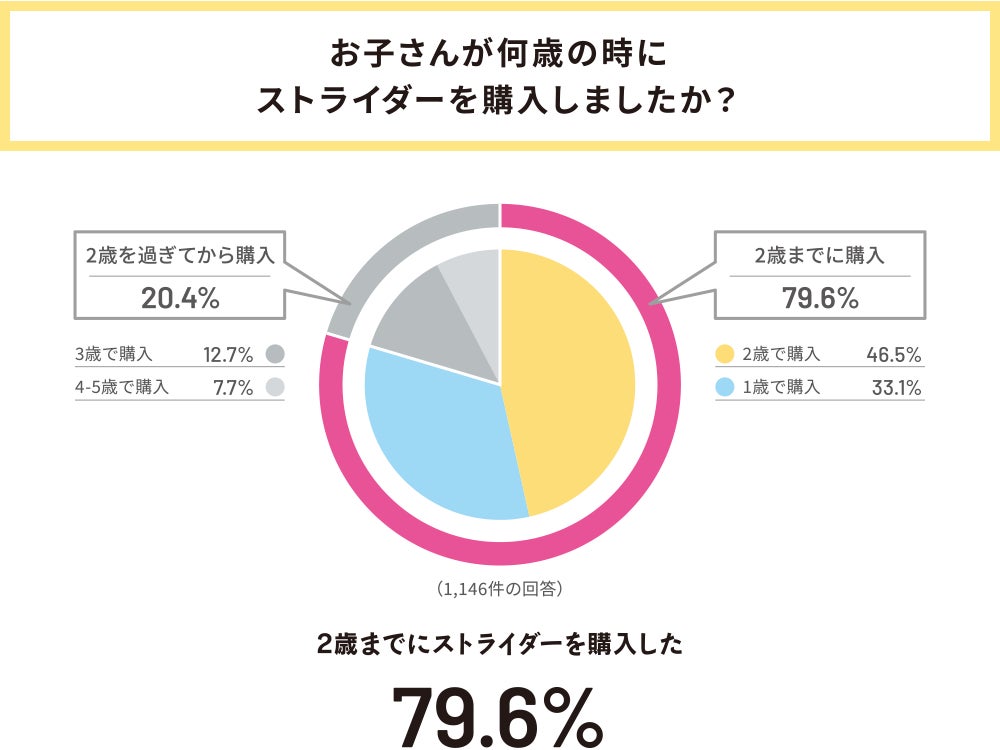 ストライダーを購入した時期について、お子さんが2歳までに購入した方が、79.6%と約8割を占め、2歳からでも十分に楽しめる乗用玩具であるということがうかがえる結果となりました。