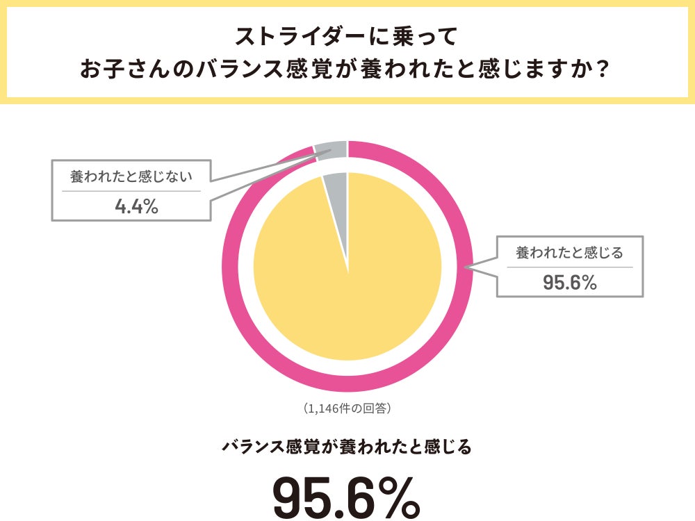 ストライダーに乗ってお子さんのバランス感覚が養われたと感じると回答した方は95.6%にのぼり、ストライダーは自らバランスをとりながらコントロールする乗り物であり、乗っているうちにバランス感覚は自然と身に付き養われていくということがうかがえる結果となりました。