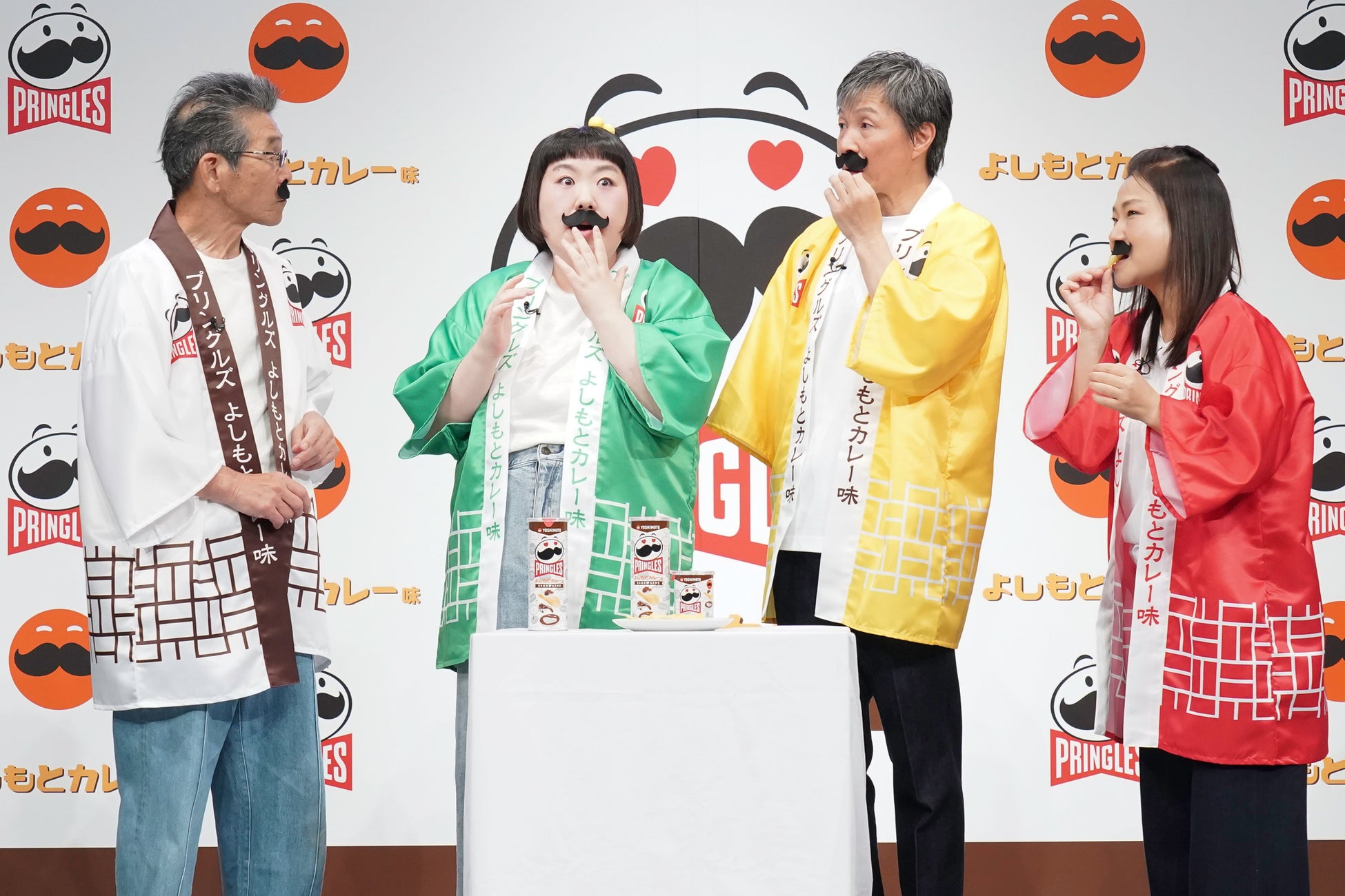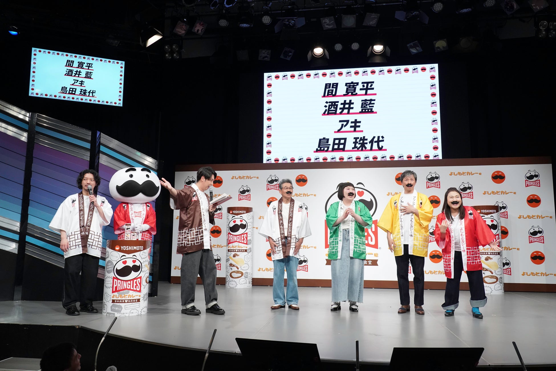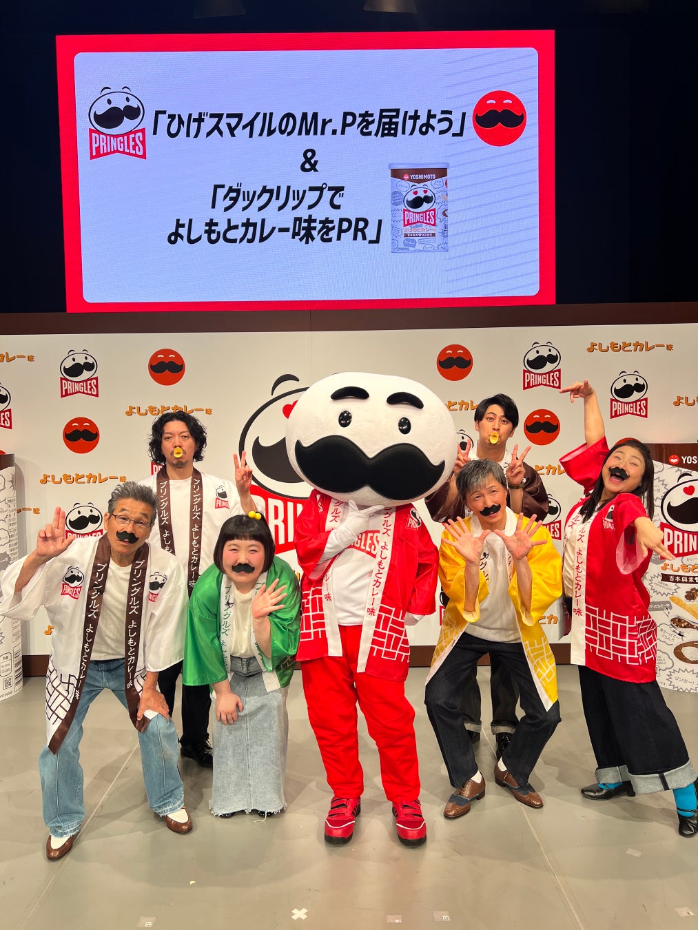 MCのニューヨークさんの掛け声に合わせて、吉本新喜劇の座員(間寛平さん・酒井藍さん・アキさん・島田珠代さん)が、プリングルズの象徴でもあるキャラクター「Mr.P」のヒゲを付け、さらにコラボはっぴを着て登場。それぞれのはっぴは、「よしもとカレー味」の「白」と「茶色」、プリングルズの定番フレーバーの「サワークリーム&オニオン」の「緑」、「Hi! CHEESE!」の「黄色」、「うましお」の「赤」の5色で、プリングルズとのコラボを表現。島田珠代さんは「Mr.Pのヒゲをつけるのが夢だった!」と今回のコラボに大喜び。