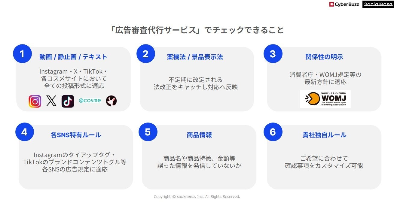 株式会社サイバー・バズ(本社:東京都渋谷区、代表取締役社長:髙村 彰典)の連結子会社で、オペレーションに特化した拠点として設立した株式会社ソーシャルベース(本社:宮崎県宮崎市、代表取締役社長:荘司 里樹)は、薬機法・景品表示法、各SNSの広告規定の観点からチェックを行うサービス「広告審査エージェント」を提供開始いたします。