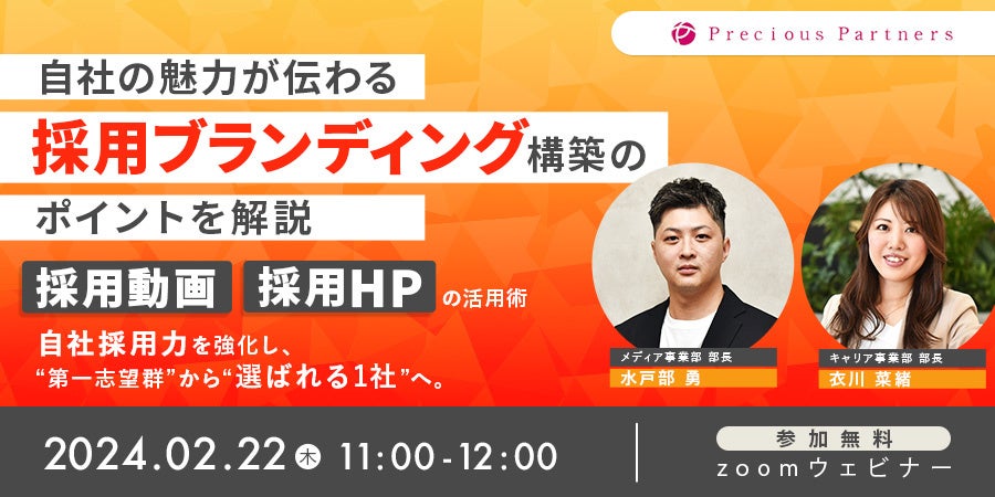 本ウェビナ―では、人財の採用から入社後の定着・活躍における採用コンサルティング支援・ツール制作を行う株式会社プレシャスパートナーズが、ターゲットから自発的に応募を獲得するための「採用動画/採用サイト」活用術や選考学生の繋ぎ止め、採用ブランディング構築方法を、実践的な情報や事例を用いて紹介・解説いたします。