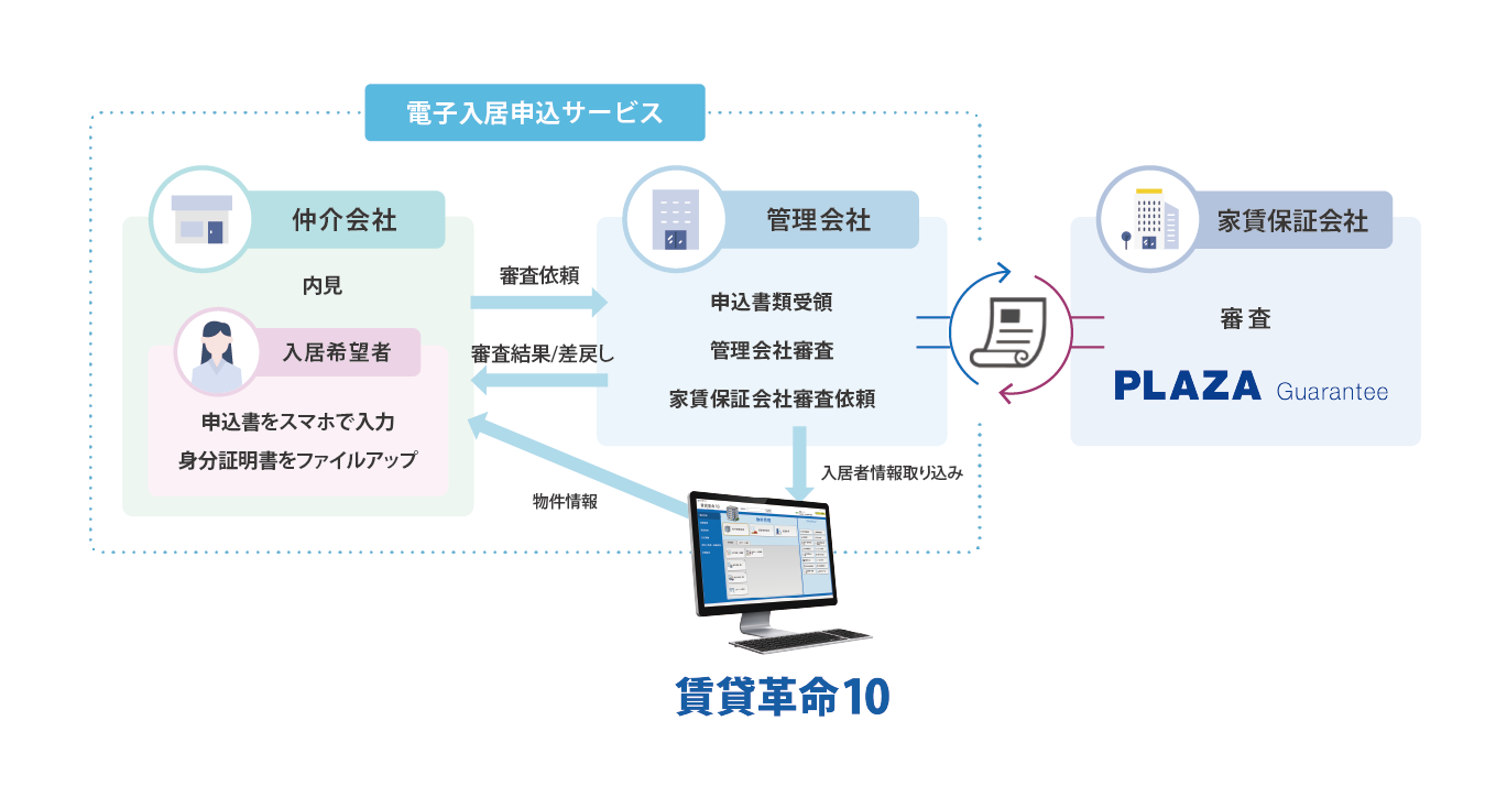 電子入居申込サービスは、弊社が不動産会社に向けて提供する無料のサービスであり、導入することで入居申込のやり取りのほとんどをオンラインで完結させることができます。また、弊社が提供するクラウド型の賃貸物件総合管理システム「賃貸革命10」と一緒にご利用いただくとで、物件情報や入居者情報等の共通のデータが連携し、作業担当者はより広い範囲での業務効率化が実現します。