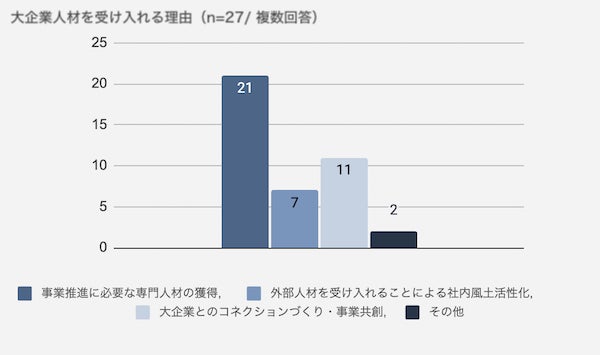 受入理由を選択してもらったところ、やはり「事業推進に必要な専門人材」という、専門知識や経験が決め手となったケースが最多となりました。次いで「大企業とのコネクション作り」そして「外部人材を受け入れることによる社内風土活性化」にも期待があるようです。