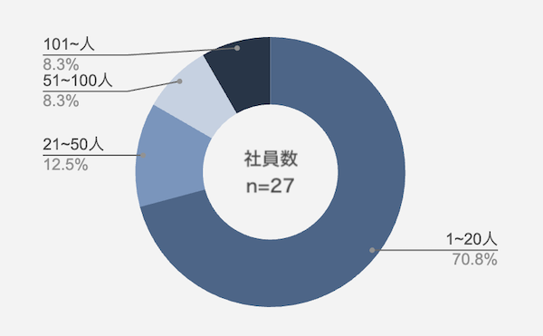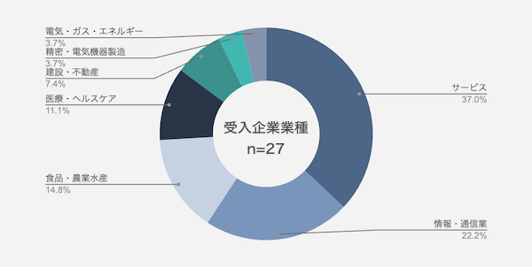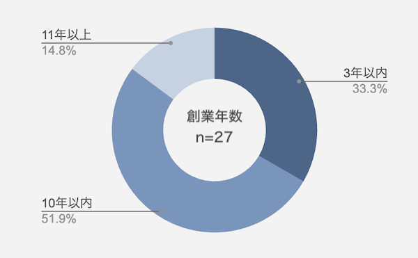 受入企業のうち、20人以下の小規模な組織が約7割を占める結果となりました。また設立年数は1/3が創業3年以内、10年以内も合わせると8割以上です。