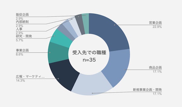 最後に、ベンチャーでの担当プロジェクトを職種としてまとめました。side projectは大企業から出てくる人材の職種が多岐に渡っていることが特徴です。そのためベンチャーでの担当範囲も多様なものとなりました。今回は営業企画・広報マーケティング・商品企画などのほか、バックオフィス系の方も1割程度います。