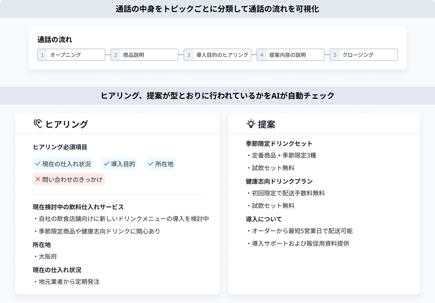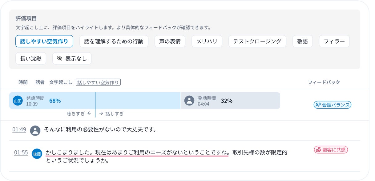 営業マネージャーが労力をかけていた「ヒアリング内容」「提案内容」「通話相手の反応」の確認を、AIが自動で要約し、迅速に評価。加えて、「会話の流れ」も可視化されるため、時間のかけ方のフィードバックも可能に。