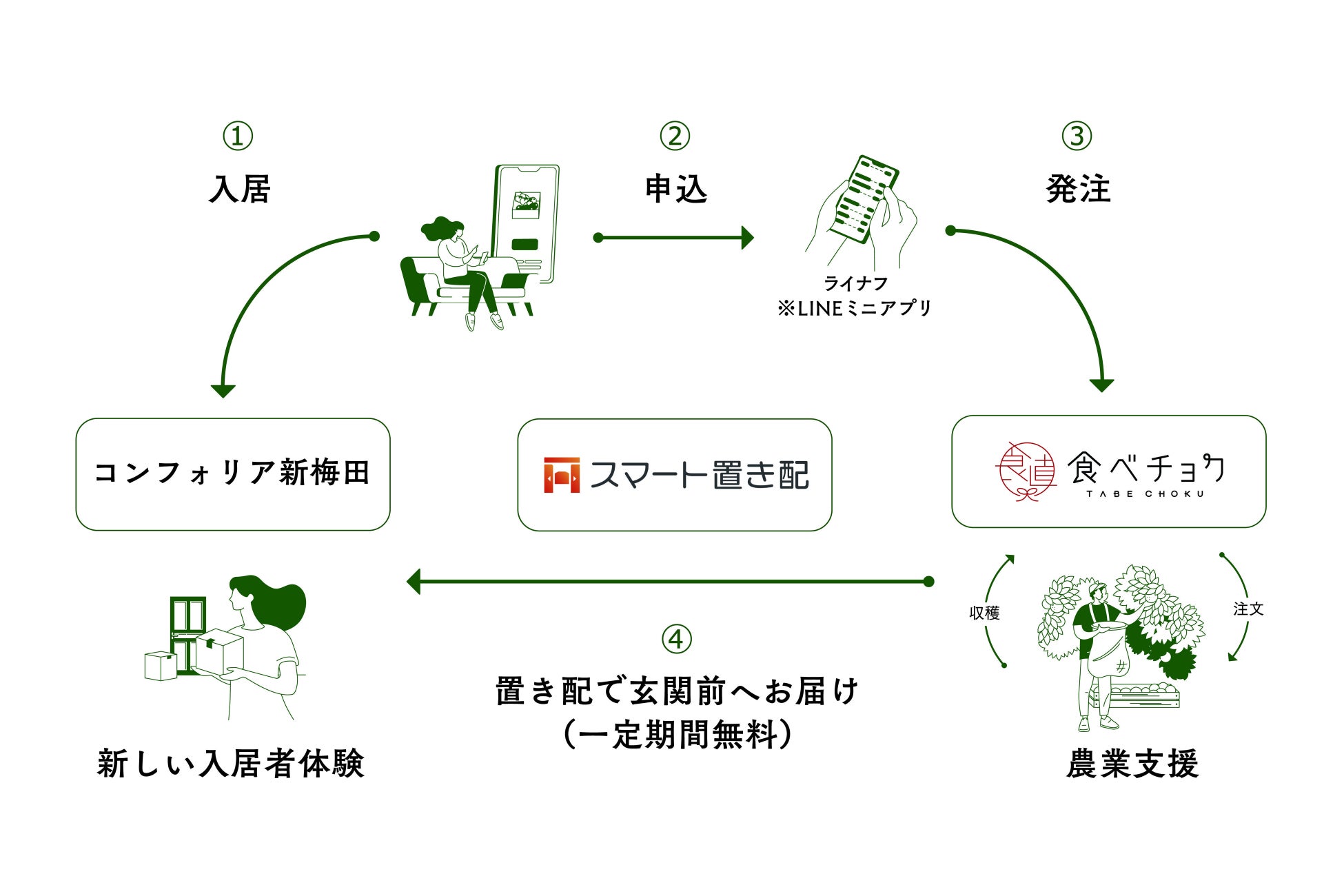 株式会社ライナフ(本社:東京都文京区/代表取締役:滝沢 潔、以下 ライナフ)は、東急不動産株式会社(本社:同渋谷区/代表取締役社長:星野 浩明)および株式会社ビビッドガーデン(本社:同渋港区/代表取締役社長:秋元 里奈)と共に、不動産に新たな価値を提供するべく、2024年3月に竣工予定の東急不動産の賃貸レジデンス「コンフォリア新梅田」において、ビビッドガーデンが運営する産直通販サイト「食べチョク」を入居者向けサービスとして導入することとなりました。それにより、入居者の健康サポートとともに生産者支援を行います。ライナフでは、「スマートロック」や「スマート置き配」を通じて、入居者が玄関前で商品を受け取れるサービスを提供します。
