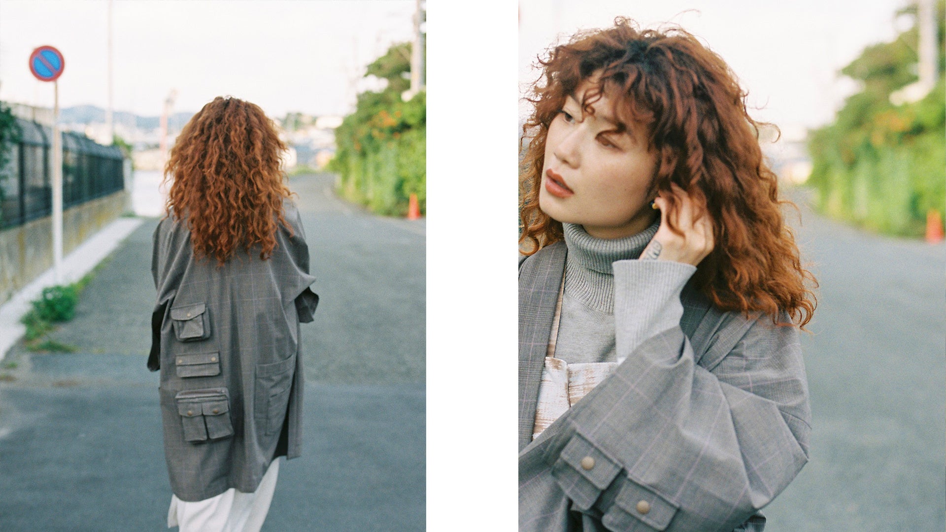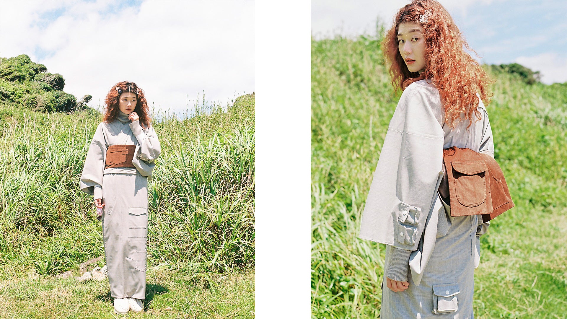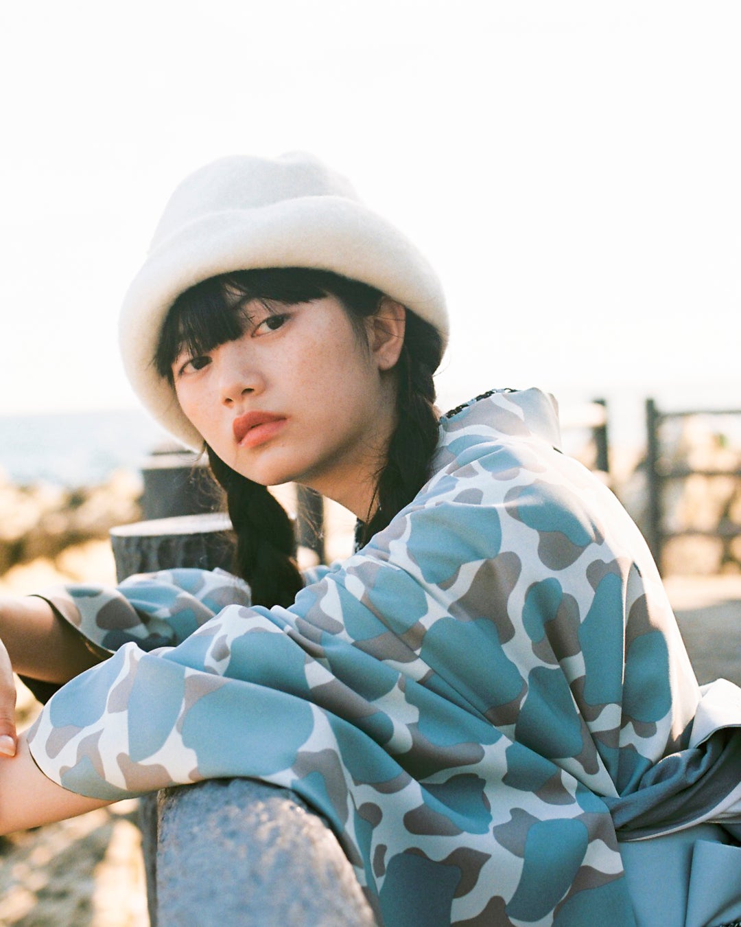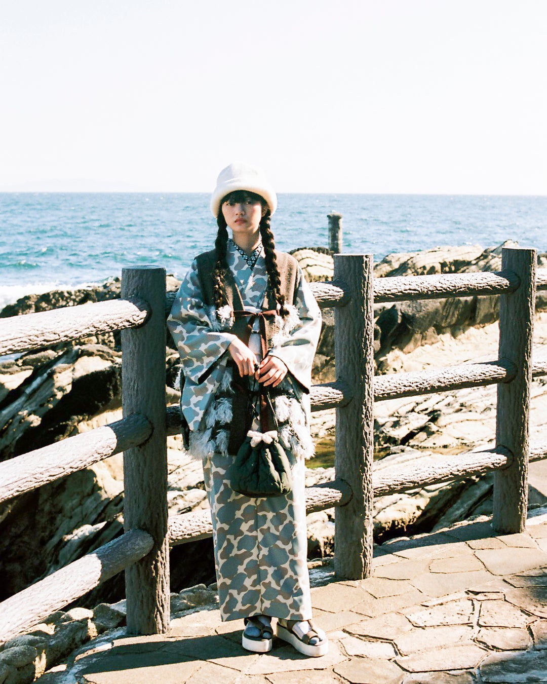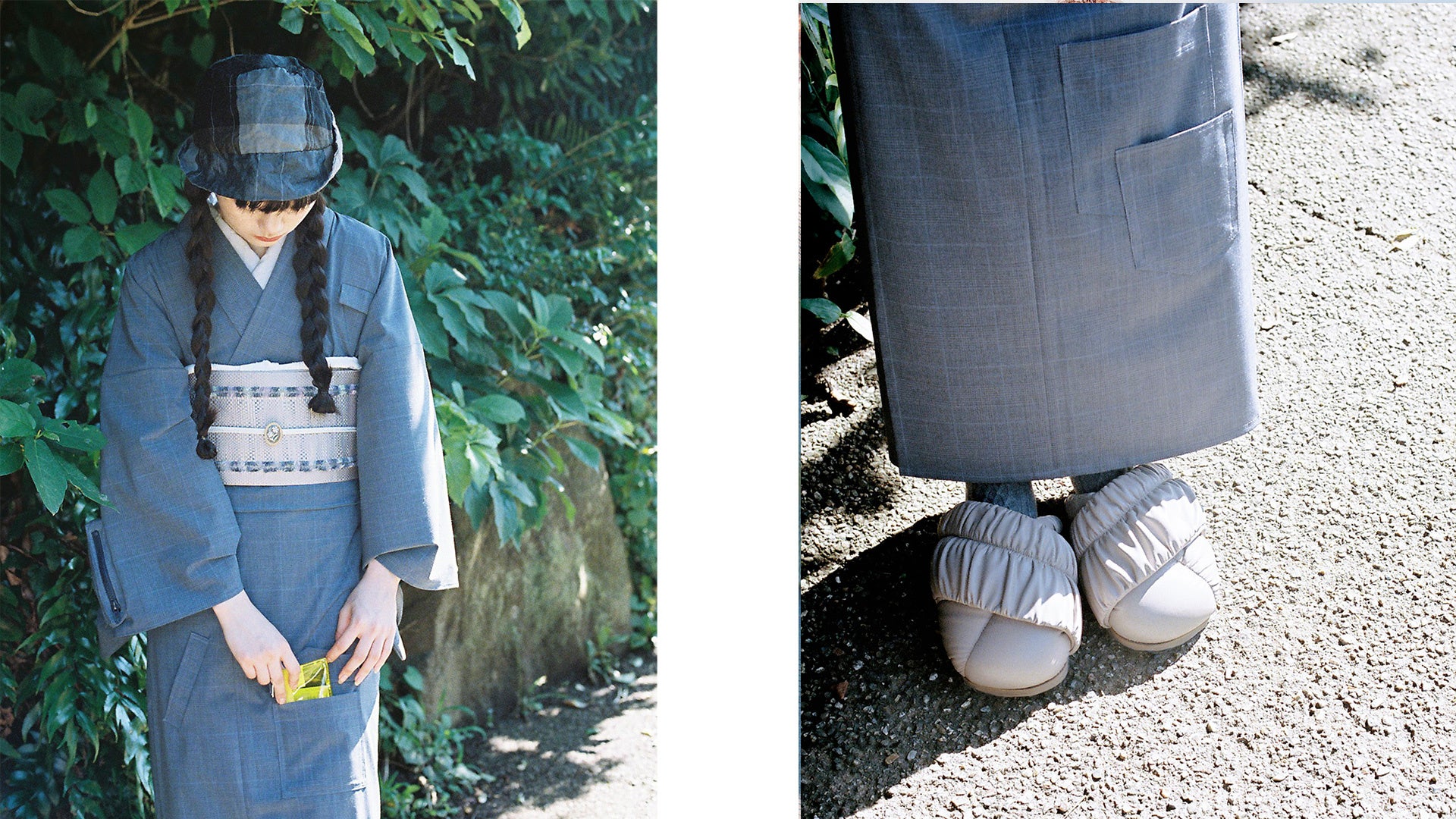 もこもことした雲のようなカモフラ柄は、実際の空の色をきものに映し出したデザインとして製作しました。今シーズンは夕暮れ空の淡い色味を使用したグレイッシュ系の配色で、どこか安心感や懐かしさを感じる自然な雰囲気に。
