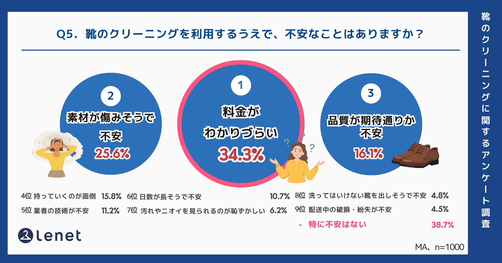 最後に靴のクリーニングを利用するうえで不安に感じることを聞いたところ、最も多かったのは「どのくらい料金がかかるのかわかりづらい」で34.3%、次いで「靴の素材が傷まないか不安」が25.6%でした。