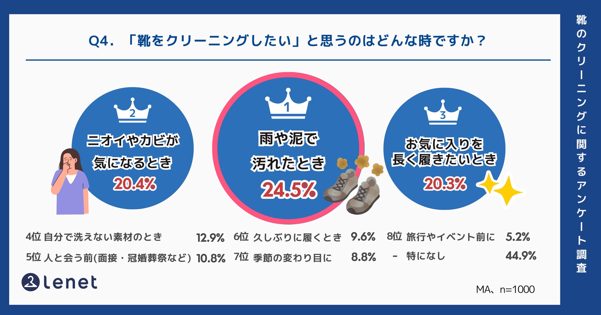 靴をクリーニングしたいと感じるタイミングは「雨や泥で汚れたとき」(24.5%)、「ニオイやカビが気になったとき」(20.4%)、「お気に入りを長く履きたいとき」(20.3%)が上位