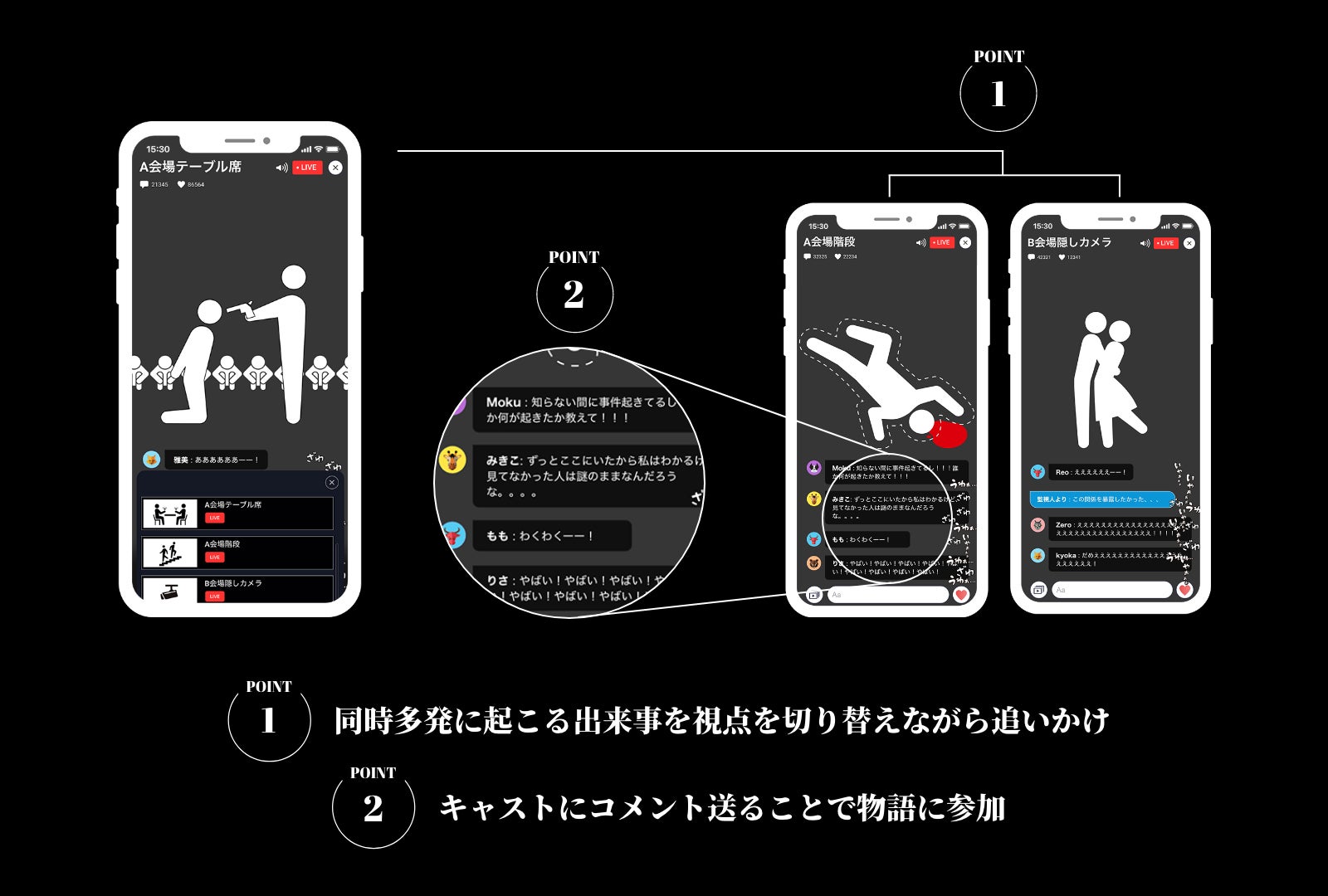 また、オンラインでご参加いただく観客の皆様には、事件の目撃者として、 同時多発的に起こる出来事を視点を切り替えながら追いかけ、キャストにコメントを送ることで物語にご参加いただきます。リアルタイムに進行する物語の世界に入り込むため、一度きり、巻き戻しなしのアトラクション体験をお楽しみいただきます。