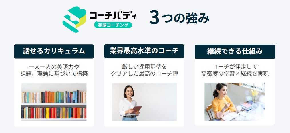 「コーチバディ」は、スピーキング特化型のオンライン英語コーチングサービスです。利便性を備えたオンライン完結型でありながら、業界最高水準の日本人コーチが専属で12週間にわたり日々の学習内容へのフィードバックを提供します。学習は、受講者のレベル、目的、状況に合わせた個別のカリキュラムに基づき進行し、AI英会話「スピークバディ」を含む語彙、文法、発音、リスニングなど多様な教材を組み合わせて、短期間で確実な上達を目指します。さらに、インプットとアウトプットのバランスを重視し、双方をつなぐ「自動化トレーニング」を導入することで、英会話力を短期間で集中的に高めたいビジネスパーソンのニーズに応えます。