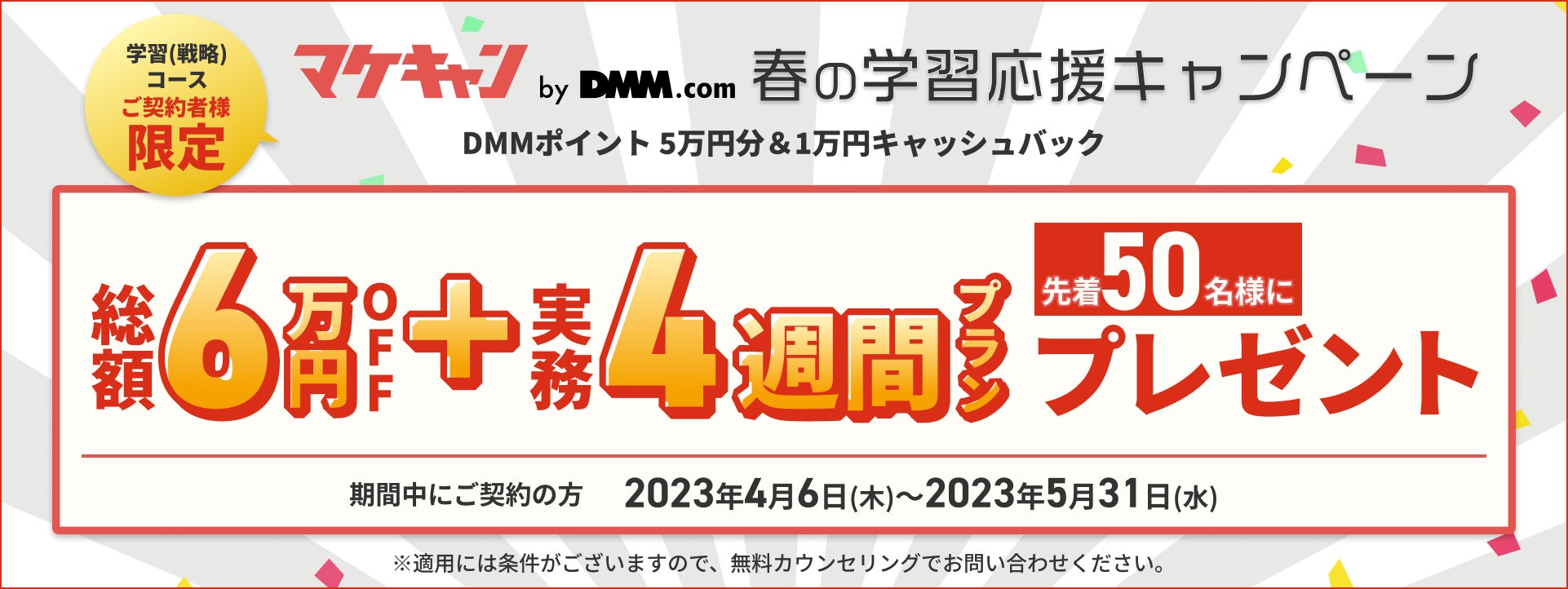 DMM.comグループの株式会社インフラトップ(本社:東京都港区、代表取締役 CEO:大島 礼頌 以下、当社)の転職保証付きWebマーケティングスクール「マケキャンbyDMM.com」(以下、マケキャン)は、対象期間中のご契約で総額6万円オフ+実務4週プラン無料プレゼントとなる「春の学習応援キャンペーン」を2023年4月6日より開催いたします。