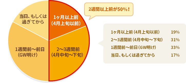 準備期間: 50%が「2週間以上前」から準備を開始。