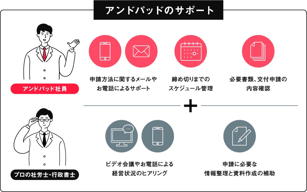 アンドパッドではお客様の申請にあたり、申請サイトへのログイン方法や、必要書類の取得方法など、申請に必要な事前準備から資料作成まで、社労士・行政書士とともにきめ細かいサポートを用意しています。