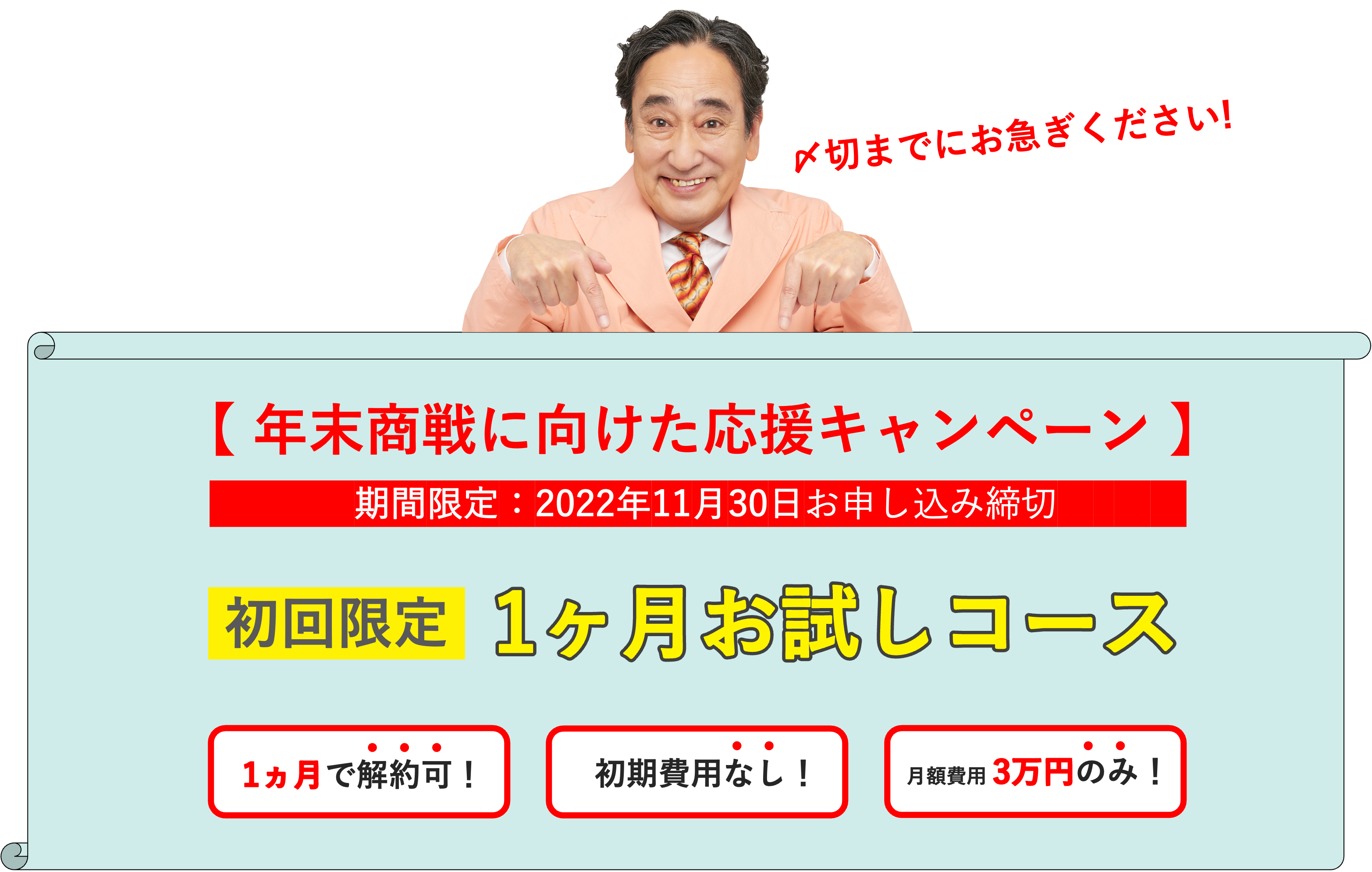 そんな店舗様には、「年末商戦に向けた応援キャンペーン ”1ヶ月お試しコース”」で、すべての課題を解決いたします。