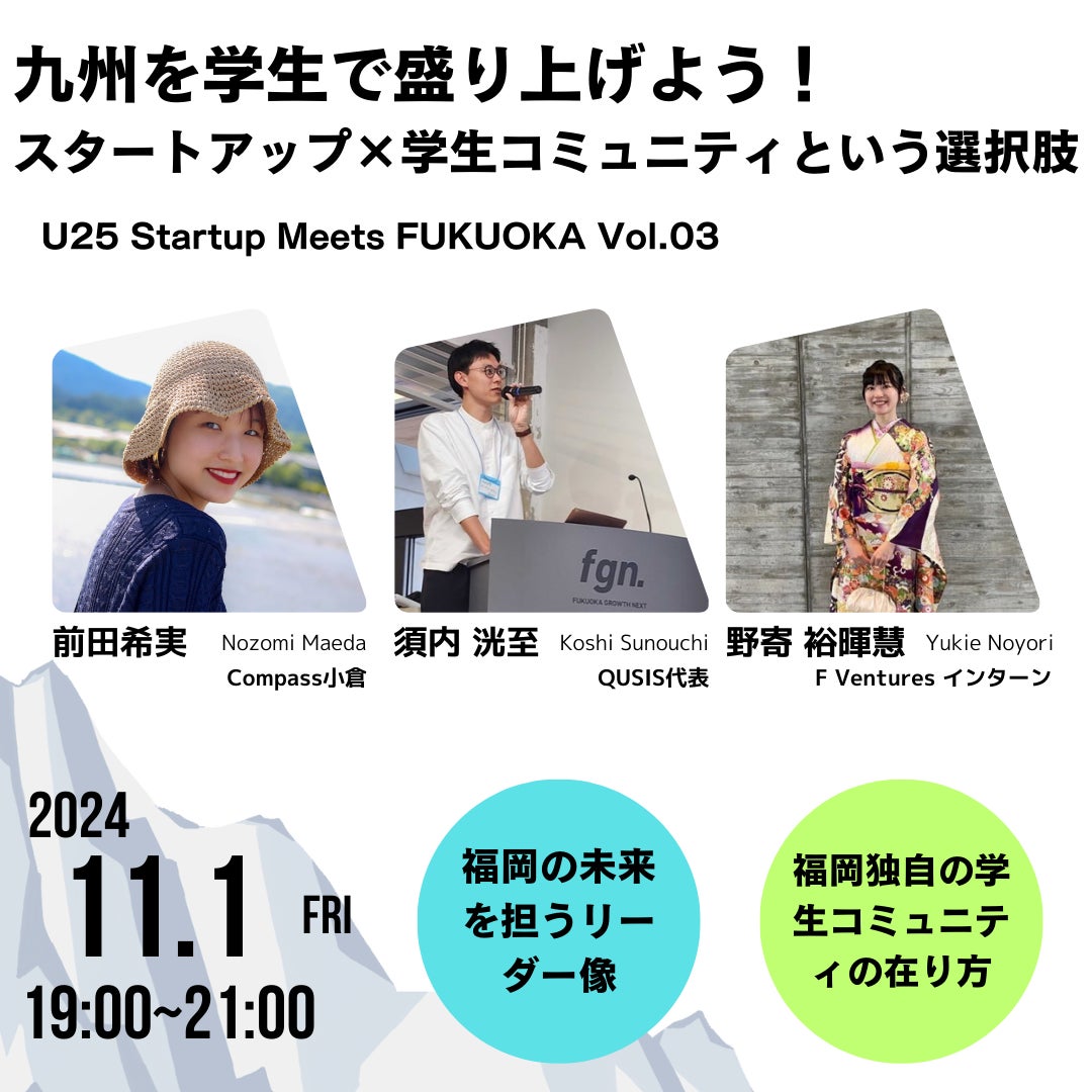 福岡の学生コミュニティを盛り上げ、未来の福岡を担う学生を少しでも多く生み出す、という想いに賛同してくれたQUSISとCompass小倉との公式サイドイベントです。福岡で活動する学生たちが、新たなアクションを起こすきっかけとなる場を提供し、起業や挑戦の機会を広げていきます。