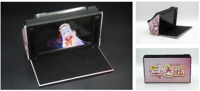 推しキャラクターやVTuberが空中映像として浮かび上がり、他にはない新感覚のファン体験を提供します。筐体デザインは1台からの完全オーダーメイドで、前面カバーと両側面にキャラクターなどを配置可能。