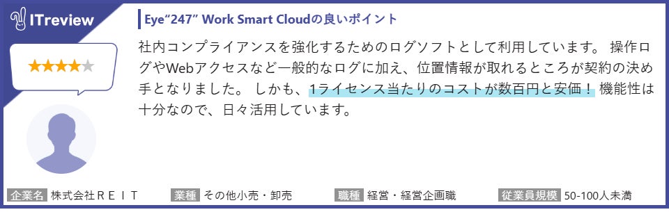 「Eye“247” Work Smart Cloud」は、ユーザーからの高い満足度と共に認知を拡大させました。そしてこの度、「ログ管理システム部門」「業務可視化ツール部門」の両カテゴリーにおいて、それぞれ「Leader」と「High Performer」を同時受賞いたしました。「Eye“247” Work Smart Cloud」は、ユーザーの声に応えながらさらなる価値向上を目指し、今後も企業の生産性向上と安心・安全な働き方の実現に貢献してまいります。