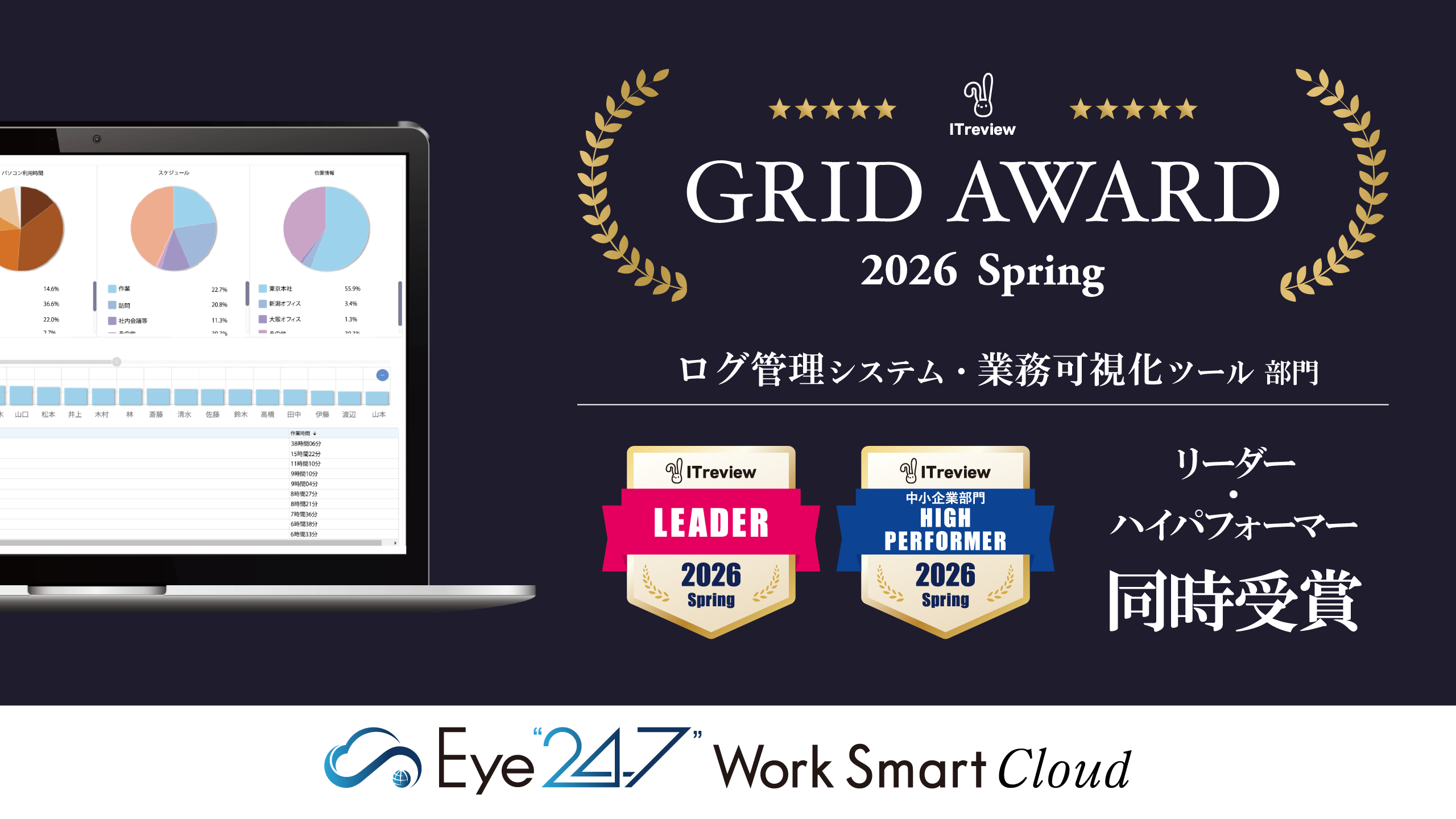 サイバーセキュリティカンパニーの株式会社フーバーブレイン(本社:東京都千代田区、代表取締役社長:輿水 英行、東証スタンダード3927、以下、当社)が提供する、PCログ管理ツール「Eye“247” Work Smart Cloud(アイ247ワークスマートクラウド)」が、アイティクラウド株式会社主催の「ITreview Grid Award 2026 Spring」において、「ログ管理システム部門」と「業務可視化ツール部門」で『Leader』および『High Performer』を同時受賞しました。