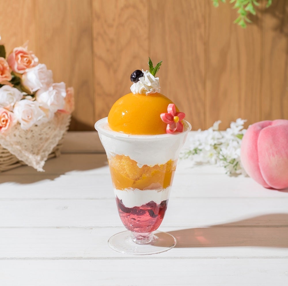 白い恋人ソフトクリームと桃を合わせ、夏らしいパフェにしました。中庭などでもお召し上がりいただけます。