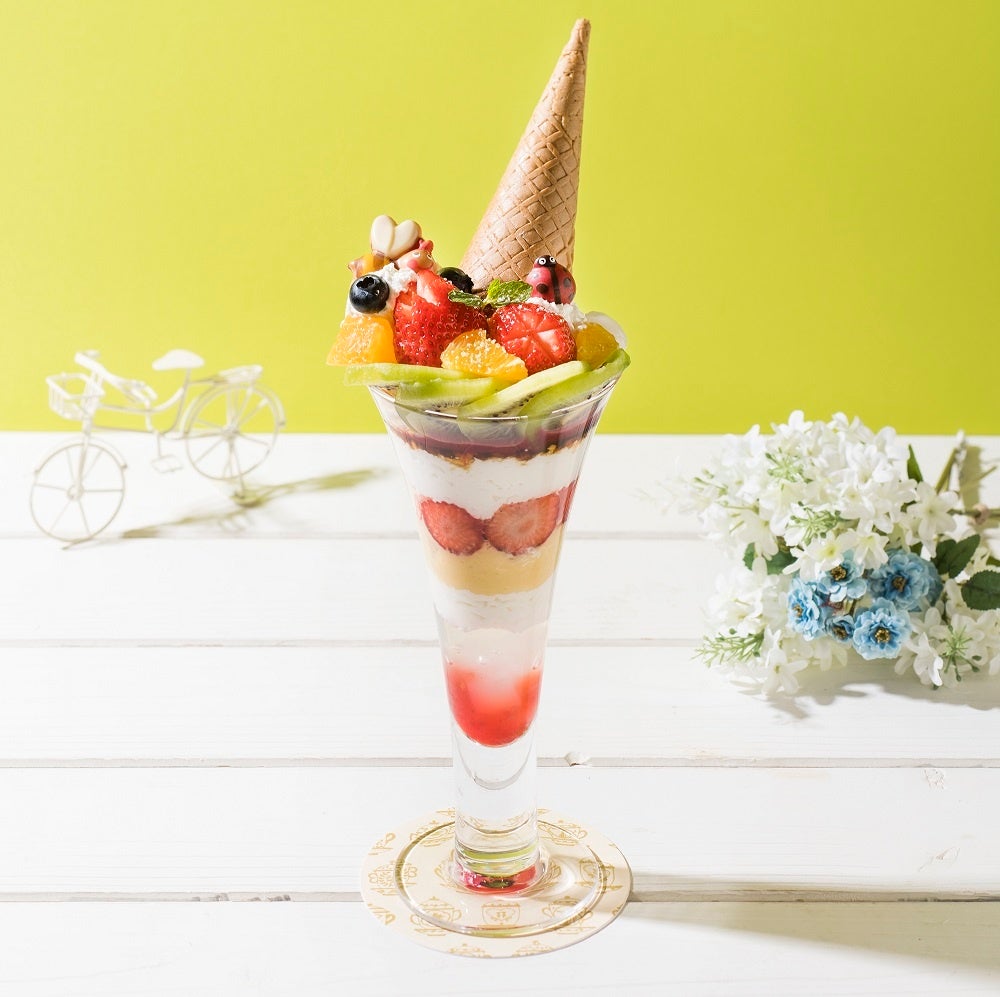 お花に見立てたいちごをメインにフルーツや白玉などを飾りました。中にはピスタチオアイスクリーム、カシスソルベ、白い恋人ソフトクリームが隠れています。