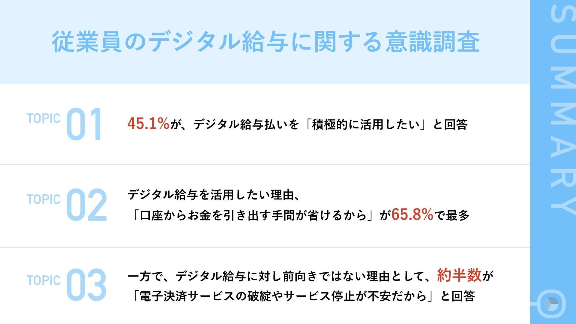 「デジタル給与」を認知する45.1%が、デジタル給与払いを「積極的に活用したい」と回答しており、理由として「口座からお金を引き出す手間が省けるから」が65.8%で最多となりました。一方で、デジタル給与に対し前向きではない理由として、約半数が「電子決済サービスの破綻やサービス停止が不安だから」と回答しました。