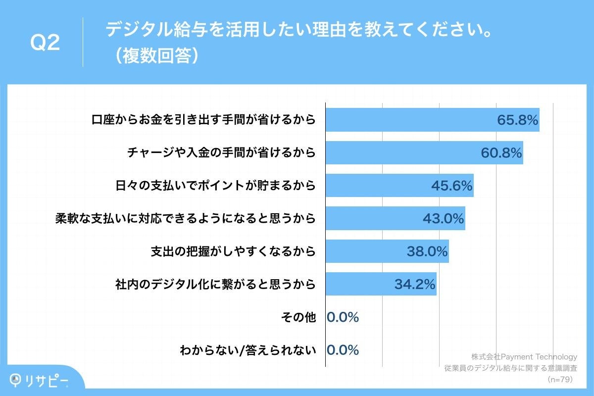 Q1で「積極的に活用する予定」「活用したいと考えている」と回答した方に、「Q2.デジタル給与を活用したい理由を教えてください。(複数回答)」(n=79)と質問したところ、「口座からお金を引き出す手間が省けるから」が65.8%、「チャージや入金の手間が省けるから」が60.8%、「日々の支払いでポイントが貯まるから」が45.6%という回答となりました。