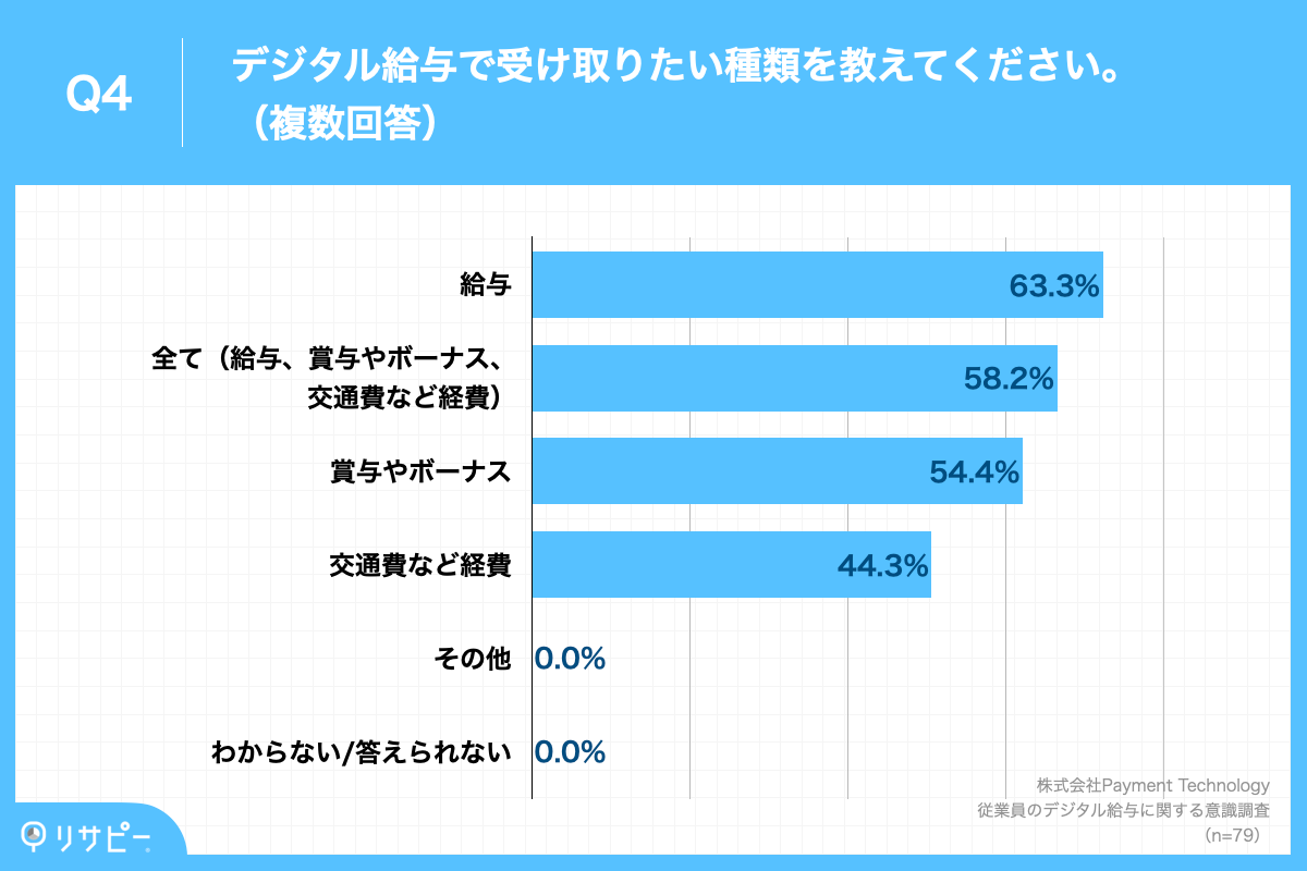 Q1で「積極的に活用する予定」「活用したいと考えている」と回答した方に、「Q4.デジタル給与で受け取りたい種類を教えてください。(複数回答)」(n=79)と質問したところ、「給与」が63.3%、「全ての支給額」が58.2%、「賞与やボーナス」が54.4%という回答となりました。
