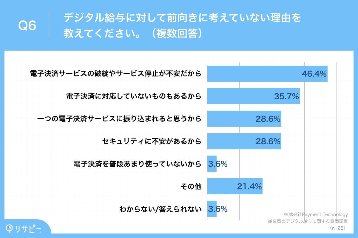 Q1で「活用する予定はない」と回答した方に、「Q6.デジタル給与に対して前向きに考えていない理由を教えてください。(複数回答)」(n=28)と質問したところ、「電子決済サービスの破綻やサービス停止が不安だから」が46.4%、「電子決済に対応していないものもあるから」が35.7%という回答となりました。