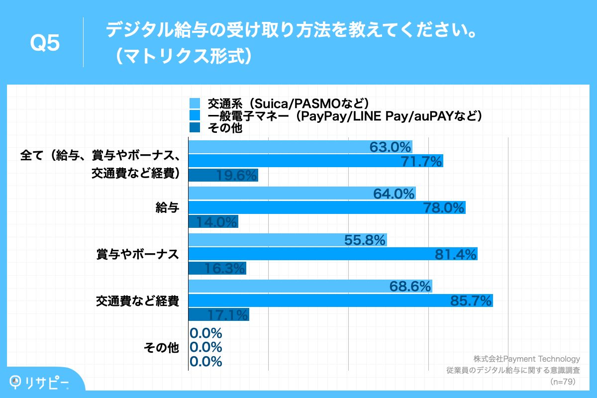 Q1で「積極的に活用する予定」「活用したいと考えている」と回答した方に、「Q5.デジタル給与の受け取り方法を教えてください。(マトリクス形式)」(n=79)と質問したところ、全ての支給額は「一般電子マネー(PayPay/LINE Pay/auPAYなど)」が71.7%、交通費など経費は「一般電子マネー(PayPay/LINE Pay/auPAYなど)」が85.7%、賞与やボーナスは「一般電子マネー(PayPay/LINE Pay/auPAYなど)」が81.4%という回答となりました。