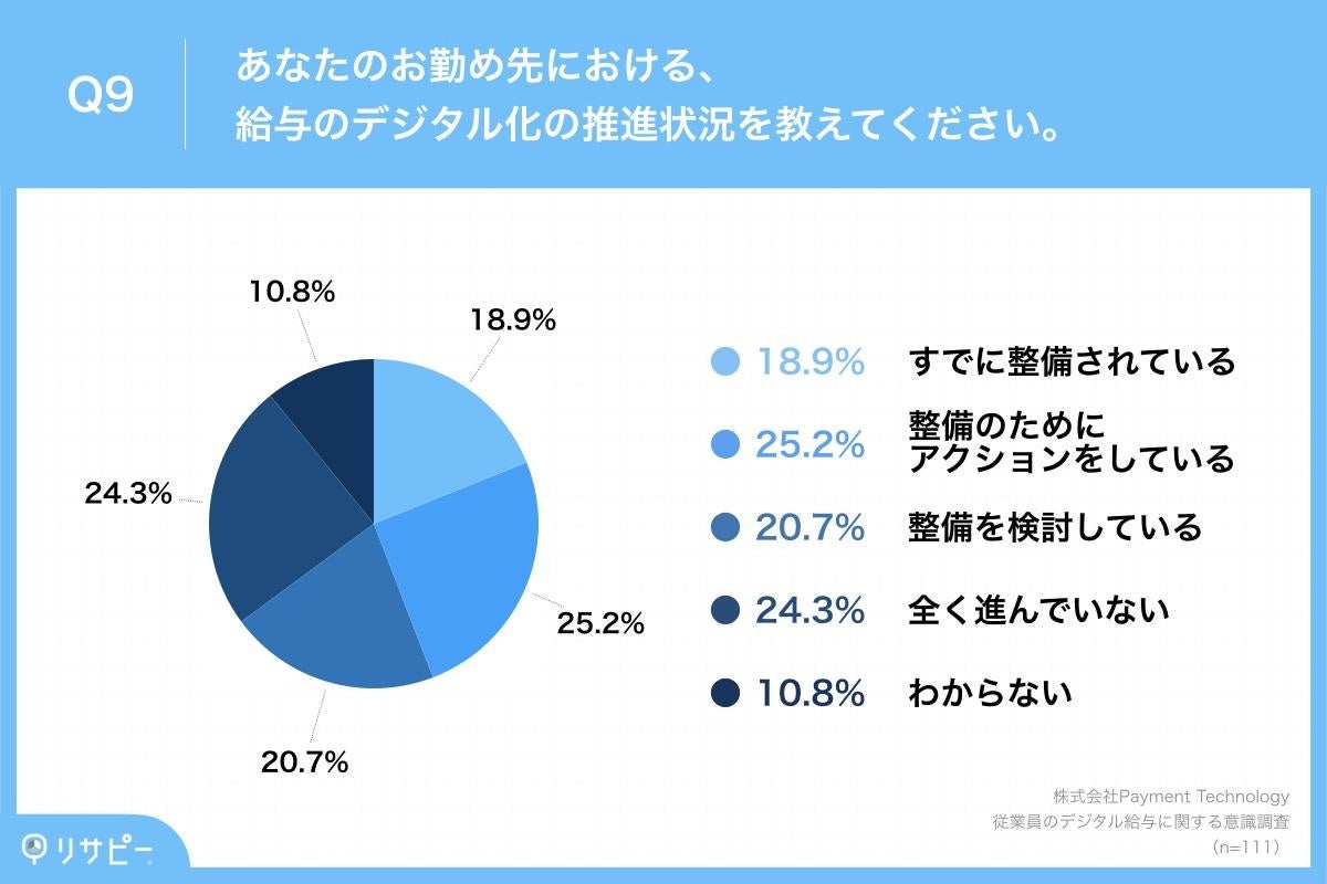 「Q9.あなたのお勤め先における、給与のデジタル化の推進状況を教えてください。」(n=111)と質問したところ、「整備のためにアクションをしている」が25.2%、「整備を検討している」が20.7%という回答となりました。