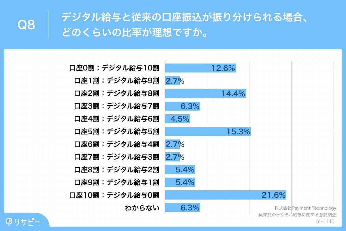 「Q8.デジタル給与と従来の口座振込が振り分けられる場合、どのくらいの比率が理想ですか。」(n=111)と質問したところ、「口座10割:デジタル給与0割」が21.6%、「口座5割:デジタル給与5割」が15.3%、「口座2割:デジタル給与8割」が14.4%という回答となりました。