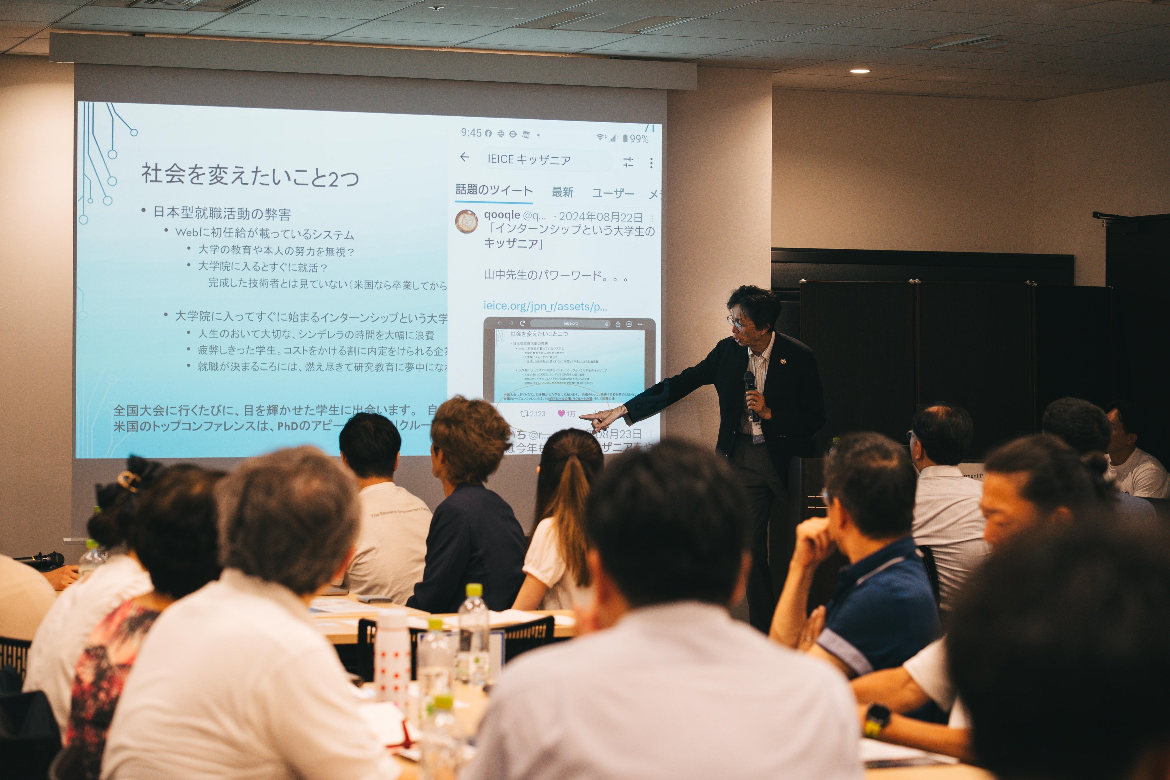 その一方で、就職活動の早期化や形式的な取り組みにも懸念を示しました。近年増えている1日や2日の短期インターンは、学生の研究時間を圧迫するだけでなく、学生・大学・企業のいずれにとっても十分な成果を生んでいない可能性があるといいます。さらに、学部卒と大学院卒を同一水準の初任給で処遇する日本特有の慣行についても触れ、能力や成果に応じた柔軟な評価や報酬体系への見直しが必要だと述べました。