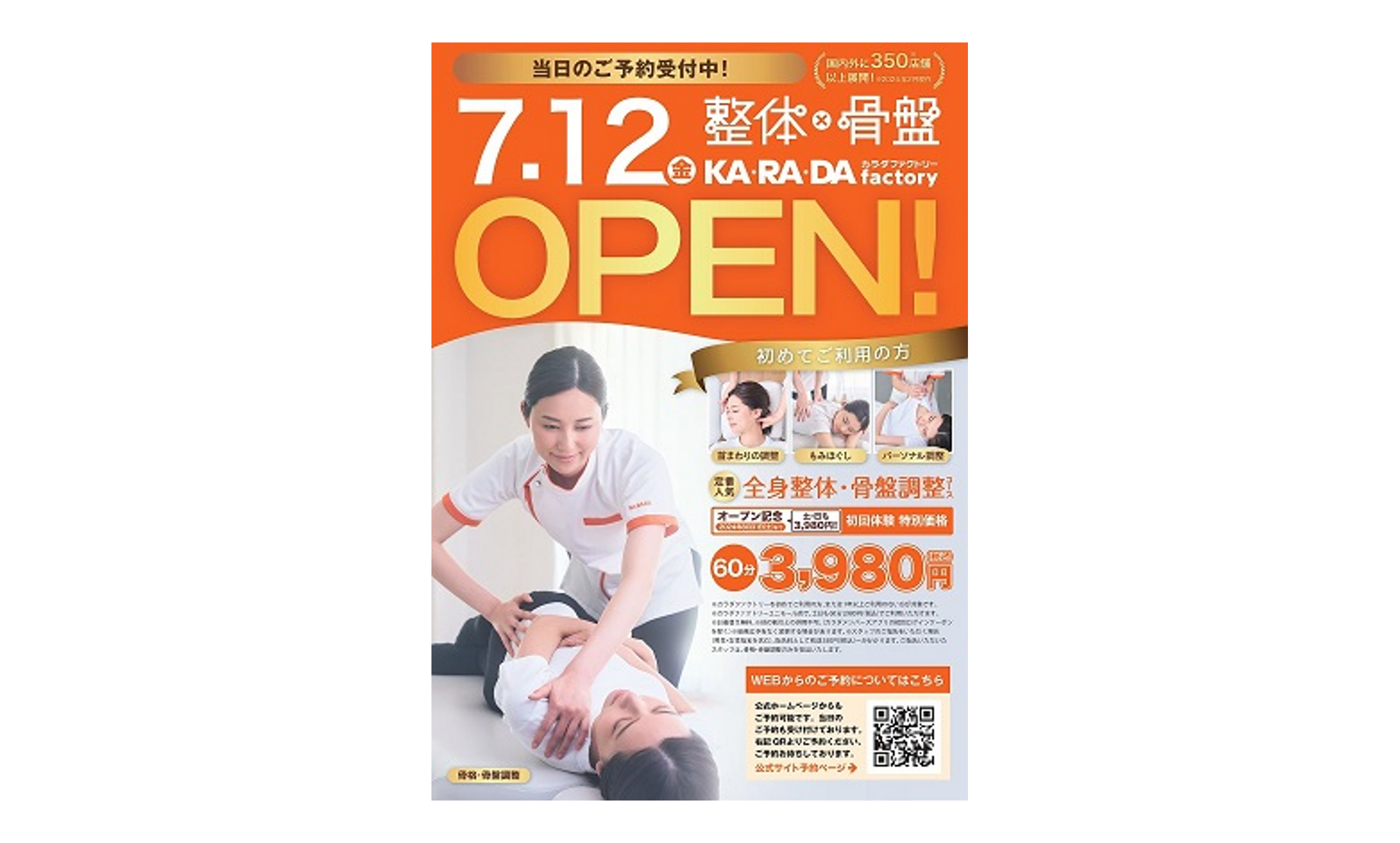 痛気持ちいい至極のオイル施術も受けられる!多数の技術が揃う整体×骨盤サロン「カラダファクトリー」 名古屋13店舗目、7月12日(金)ユニモールにグランドオープン!