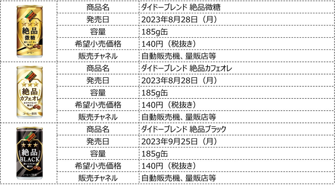 この度発売するのは、香り・コク・キレをさらに極めた「ダイドーブレンド 絶品微糖」、ミルクとコーヒーの調和をさらに極めた「ダイドーブレンド 絶品カフェオレ」、深いコクとキレを極めた「ダイドーブレンド 絶品ブラック」の3品です。