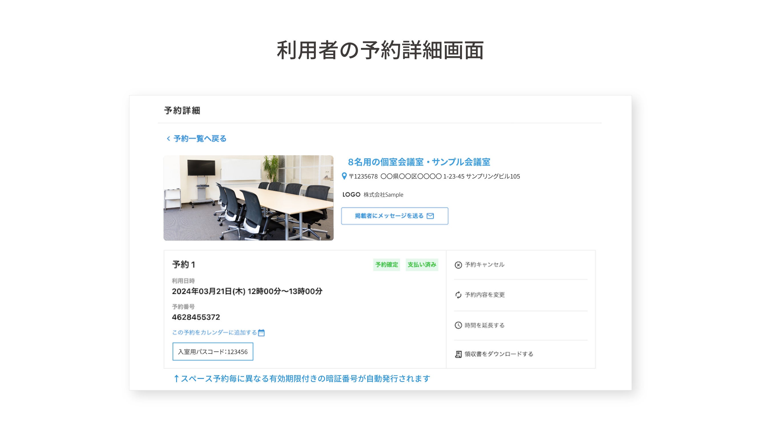 この度の連携では電子制御ドアにも対応が可能になったことで、マンション共用部の貸出、自社オフィスの会議室の貸出、商業施設の休日貸出など、建物の入口から使用するお部屋まで、鍵の受け渡しの手間がない、無人運営を実現いただくことができます。