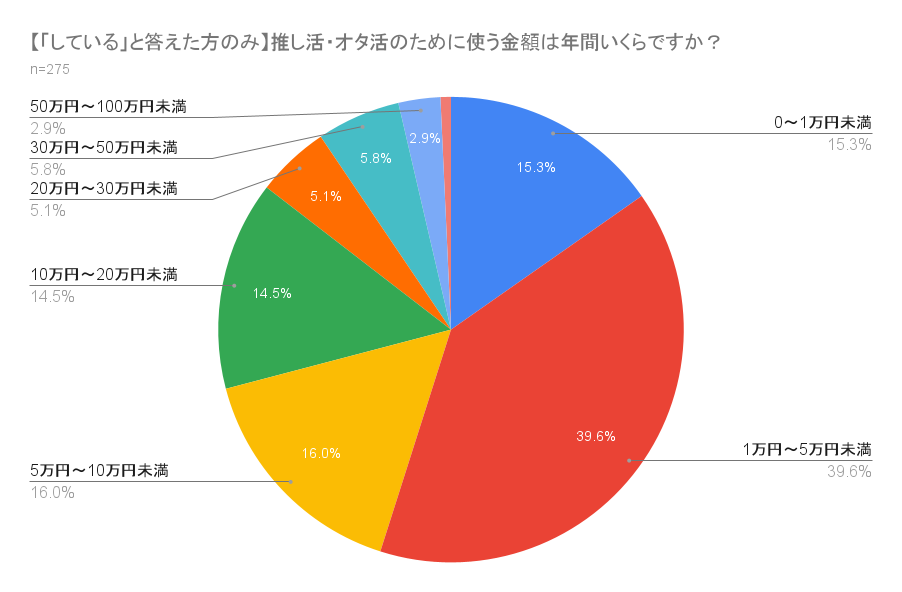 活動のため1年間に使う金額でもっとも多かったのは「1〜5万円未満」で約4割。全体でみると、約85%が年間20万円以下という結果に。一方「50万円〜100万円未満」は約3%、「100万円以上」は0.7%にとどまっている。