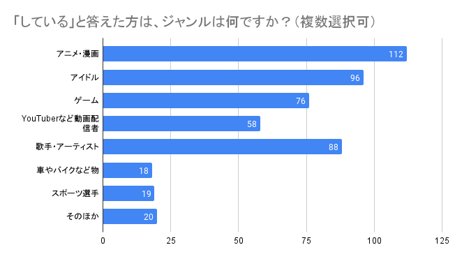 活動しているジャンルは、トップが「アニメ・漫画」。続いて「アイドル」「歌手・アーティスト」「ゲーム」という結果だった。