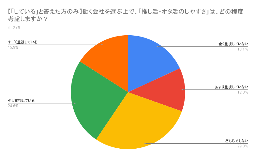 就職・転職で会社を選ぶ際、「推し活」「オタ活」のしやすさをどの程度考慮するかという問いに対して、約4割が「活動しやすさを重視する」と回答。「重視しない」という回答は約3割だった。