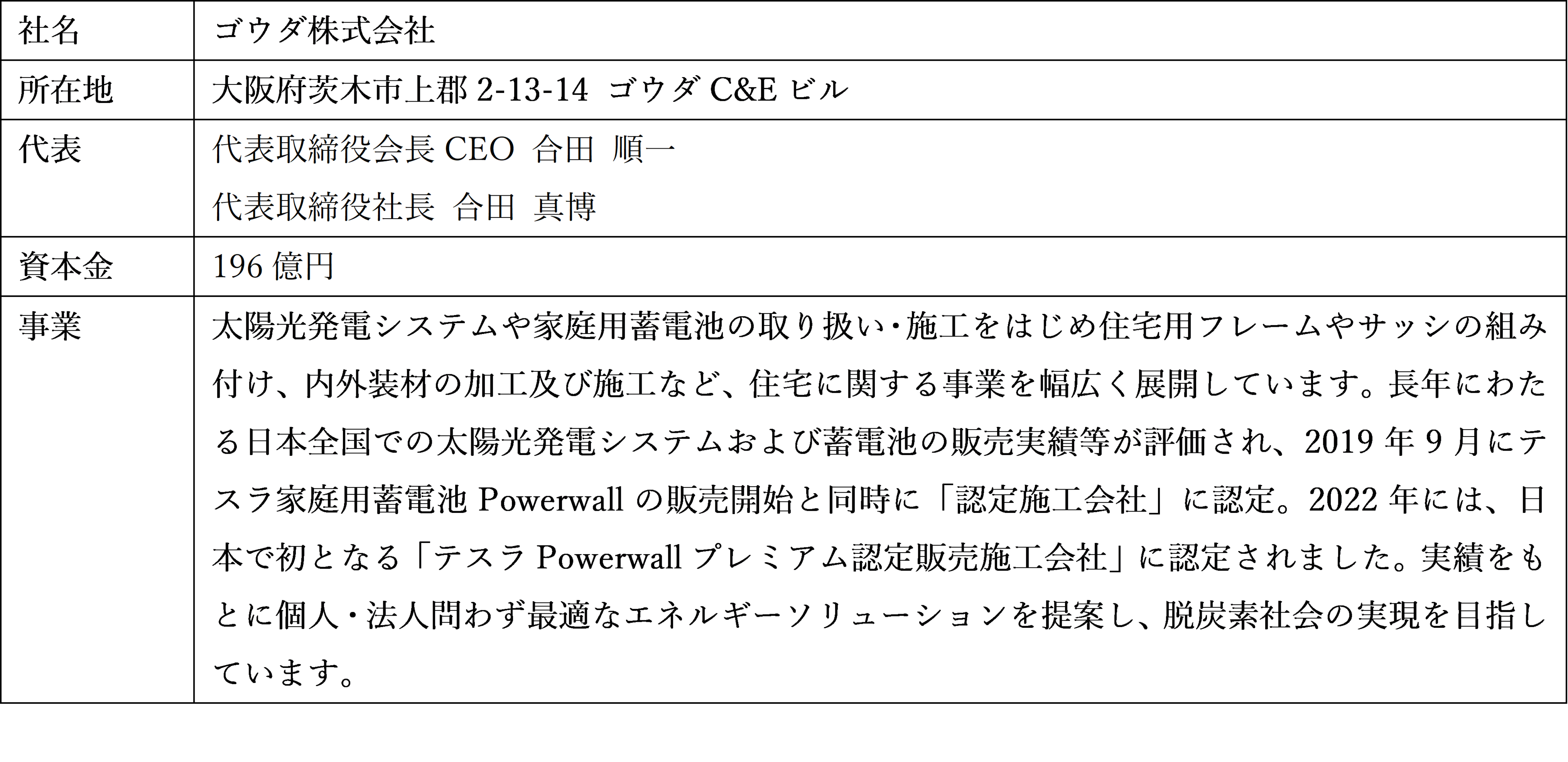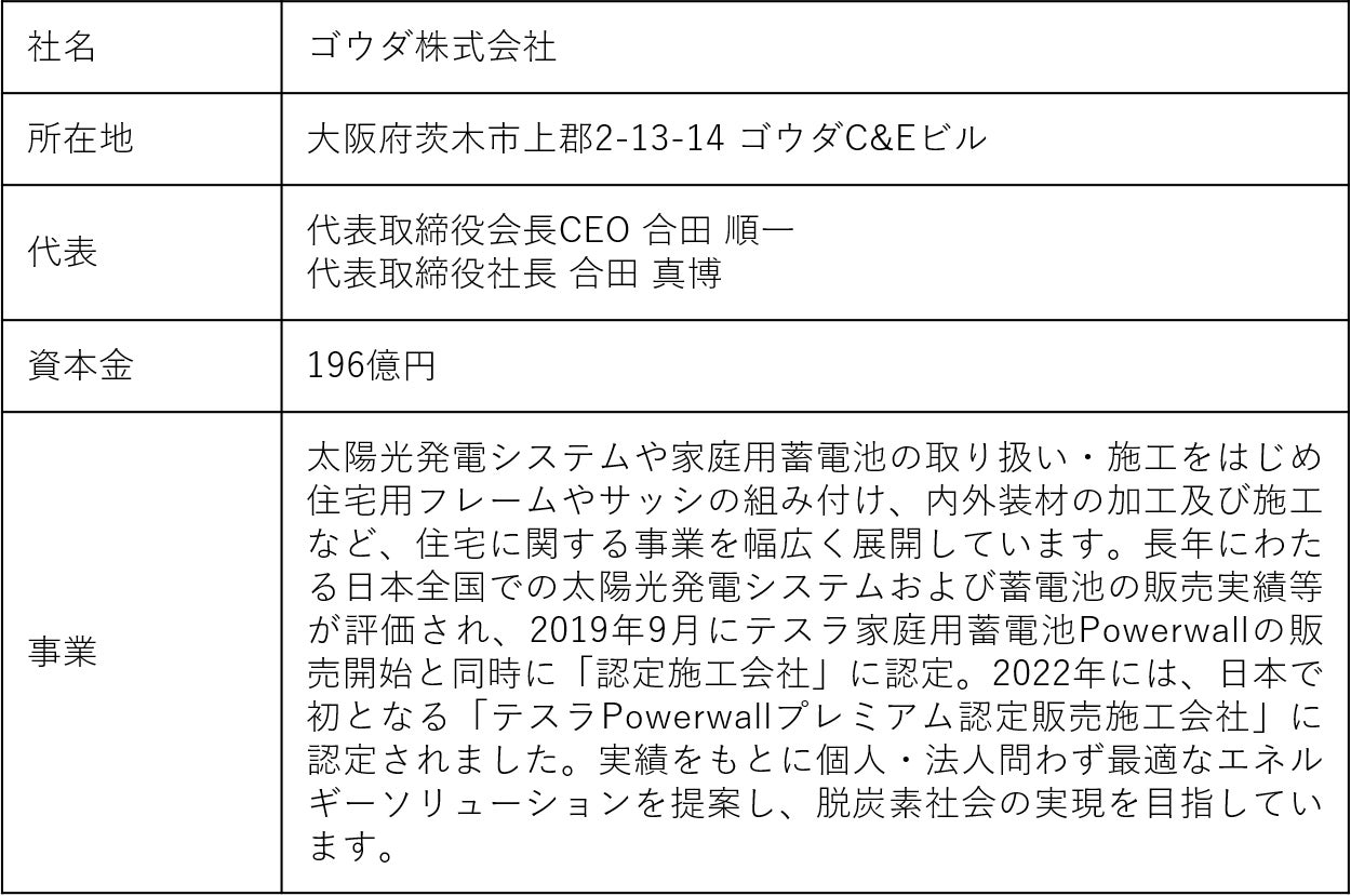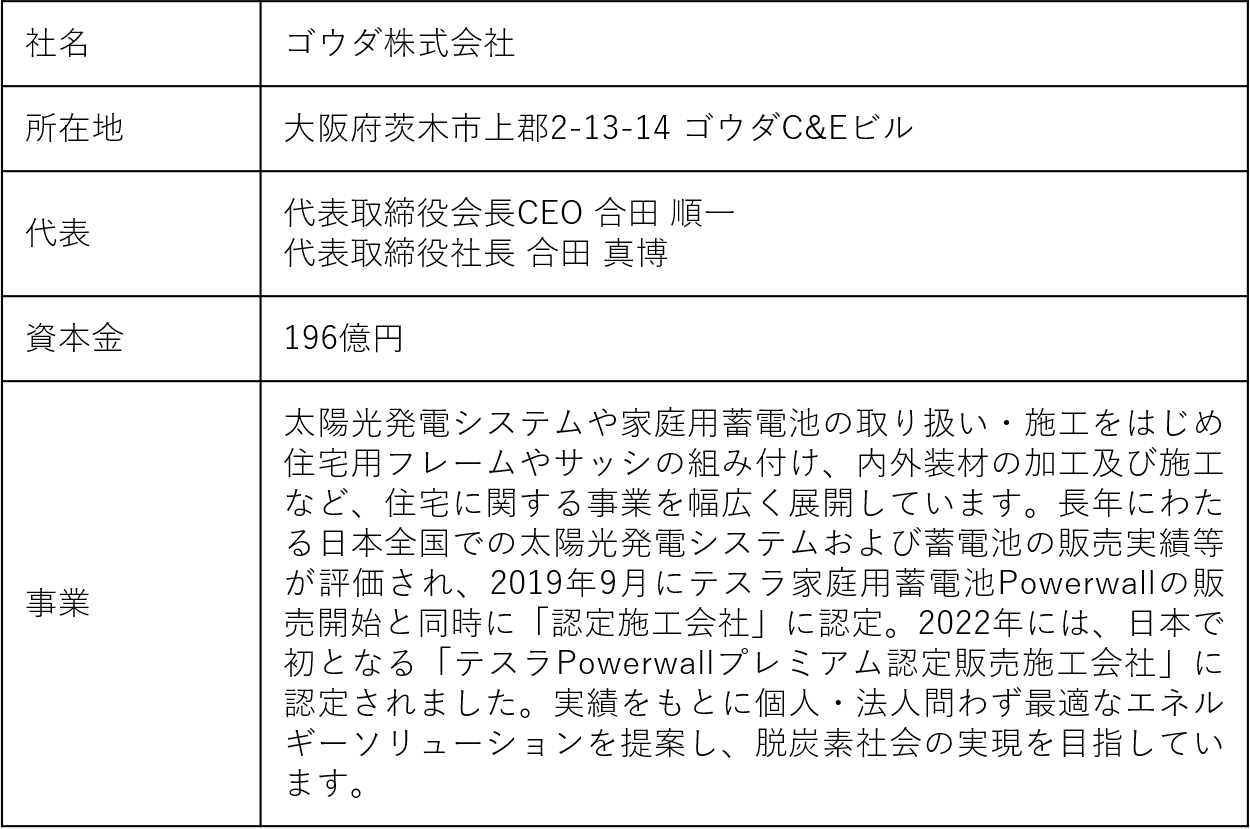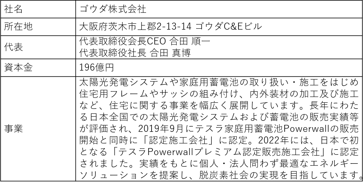 当社は2022年9月よりテスラPowerwallプレミアム認定販売施工会社であるゴウダ株式会社(以下、ゴウダ社)と業務提携し、SDGs番号7「エネルギーをみんなに、そしてクリーンに」、SDGs番号11「住み続けられるまちづくりを」、SDGs番号12「つくる責任 つかう責任」、SDGs番号13「気候変動に具体的な対策を」、SDGs番号15「陸の豊かさも守ろう」の目標達成を推進するため、テスラPowerwallの取り扱いを開始いたします。