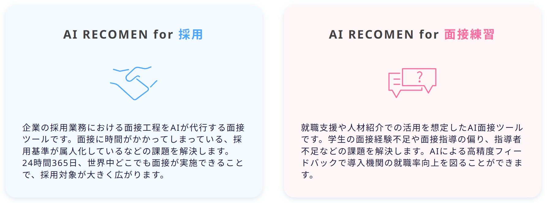 AI RECOMENは、AIを活用して企業の人事面接の工数削減や、学生の面接対策を行うことができるAI面接ツールです。最先端のAI技術やビッグデータを活用し、人事担当者・求職者双方に快適な人事・就職活動環境を提供します。