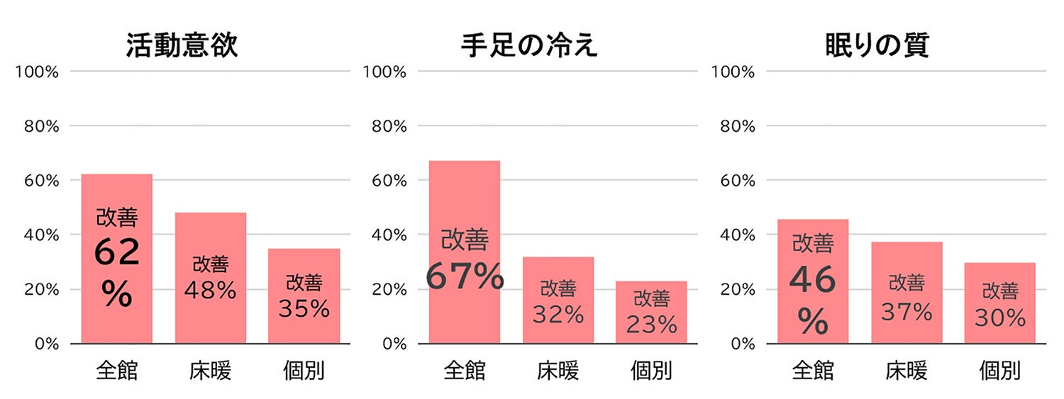 結果、「高性能フィルター搭載の全館空調」を導入した住宅への転居者は、花粉症、アレルギー性鼻炎、手足の冷え、寝つき、眠りの質、寝起き、活動意欲等の改善率が有意に高いことが確認できました。このことから、住宅内の温熱環境・空気質が住む人の健康や生活の質へ影響を及ぼし、快適な暮らしのためには、換気・空調設備の方式選定が重要になると言えます。