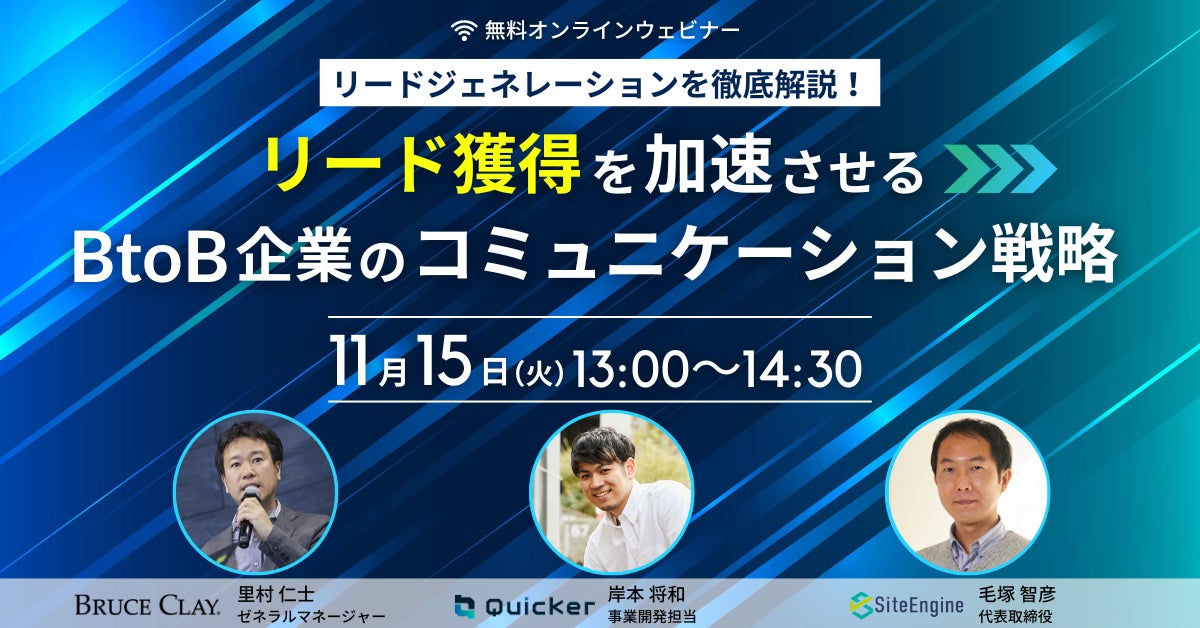 「自己表現にテクノロジーとアイデアを」を経営理念としてWebマーケティング支援サービスを提供するサイトエンジン株式会社(本社:東京都世田谷区 代表取締役:毛塚 智彦)は、2022年11月15日(火)13:00~14:30に、ブルースクレイ・ジャパン株式会社(本社:東京都渋⾕区 代表取締役:天野 拓)、Quicker株式会社(本社:東京都渋⾕区 代表取締役CEO:渡邊 将太)との "リード獲得を加速させる BtoB企業のコミュニケーション戦略" を開催します。