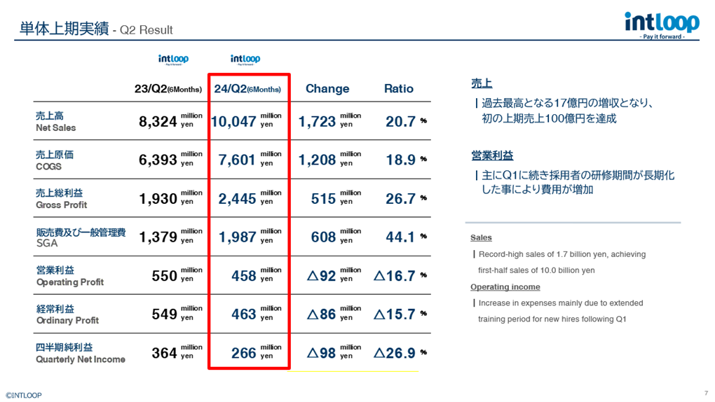 単体の上期実績としても売上高は過去最高となる17億円の増収となり、上期時点で初めて100億円を達成しました。営業利益について、採用者の研修期間が長期化したことにより費用が増加しております。