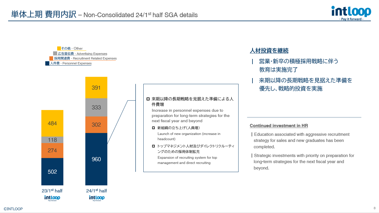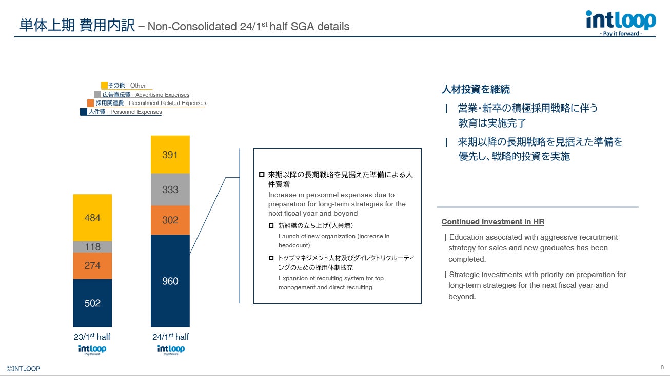 単体上期の費用内訳について、案件規模拡大・利益向上を企図した新卒の営業の積極採用戦略による、教育は実施完了しております。また、来期以降の長期戦略を見据えた準備を優先し、戦略的投資を実施します。