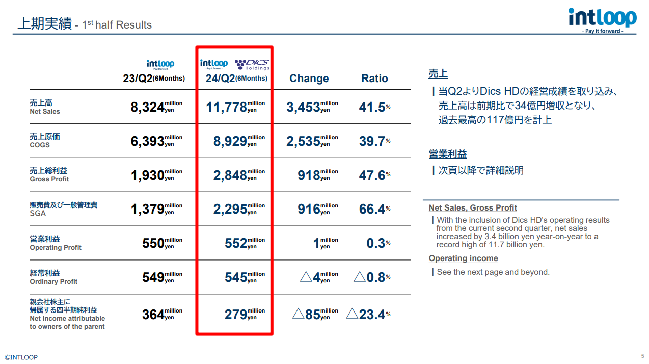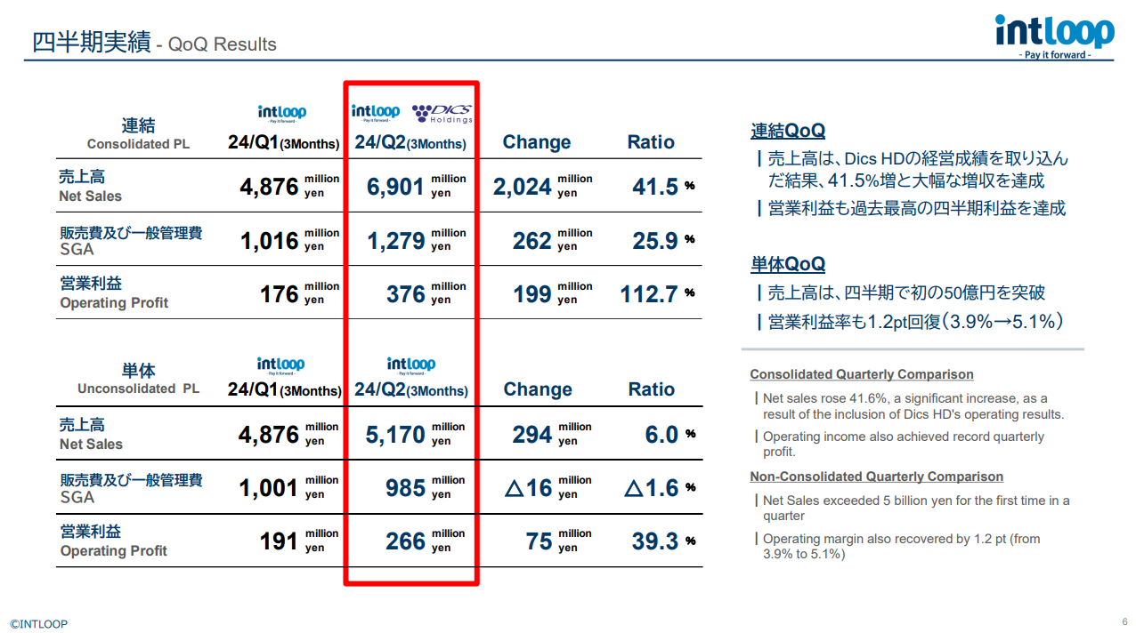 2024年7月期の第二四半期の連結売上高は、グループ化したディクスホールディングスの経営成績を取り込んだ結果117億円となり、過去最高額を更新しました。連結営業利益は第一四半期の176百万円から376百万円まで増加し、QoQで113%増と大幅に改善しております。社員への教育効果も出始め、単体としても191百万円から266百万円と改善しております。