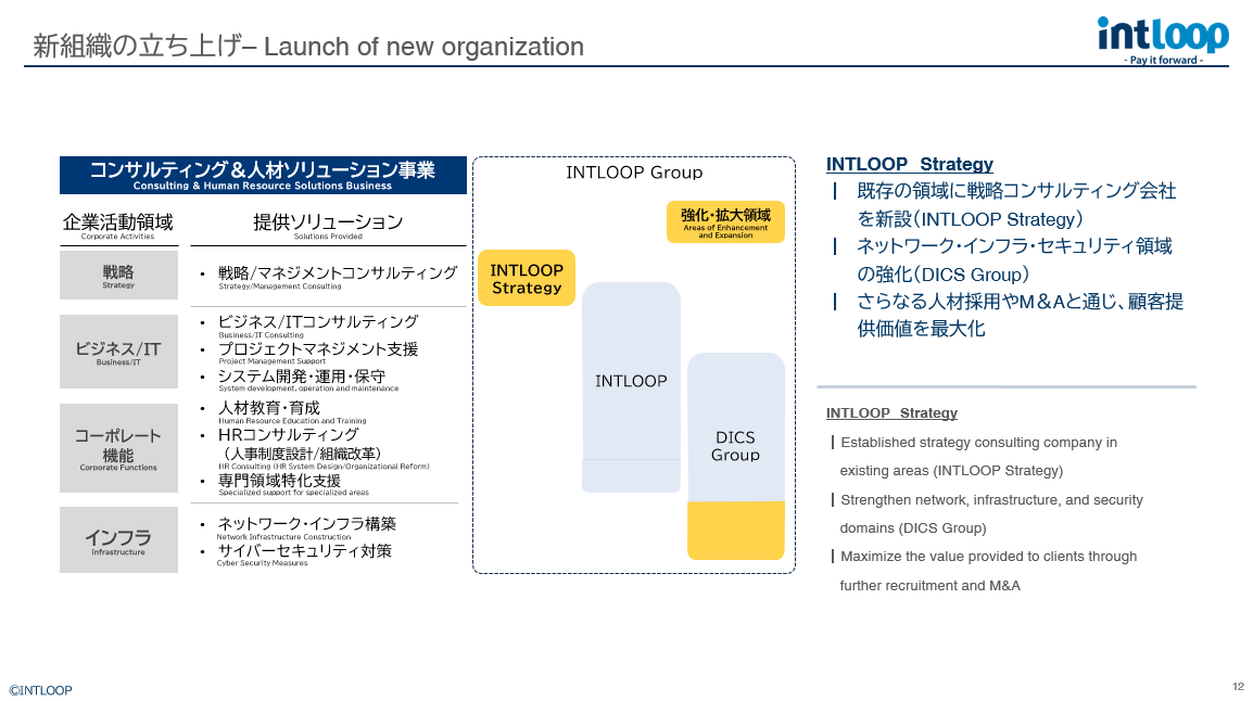 既存の領域に加えて、戦略・マネジメントコンサルティングを提供する戦略コンサルティング会社「INTLOOP Strategy」を新設しました。また、ネットワーク・インフラ・セキュリティ領域の強化を狙ったディクスグループのグループ化により、提供ソリューションを拡大させております。今後も戦略組織を活用し、人材採用や新規事業、更なるM&A検討の加速を通じて顧客提供価値の最大化を目指します。